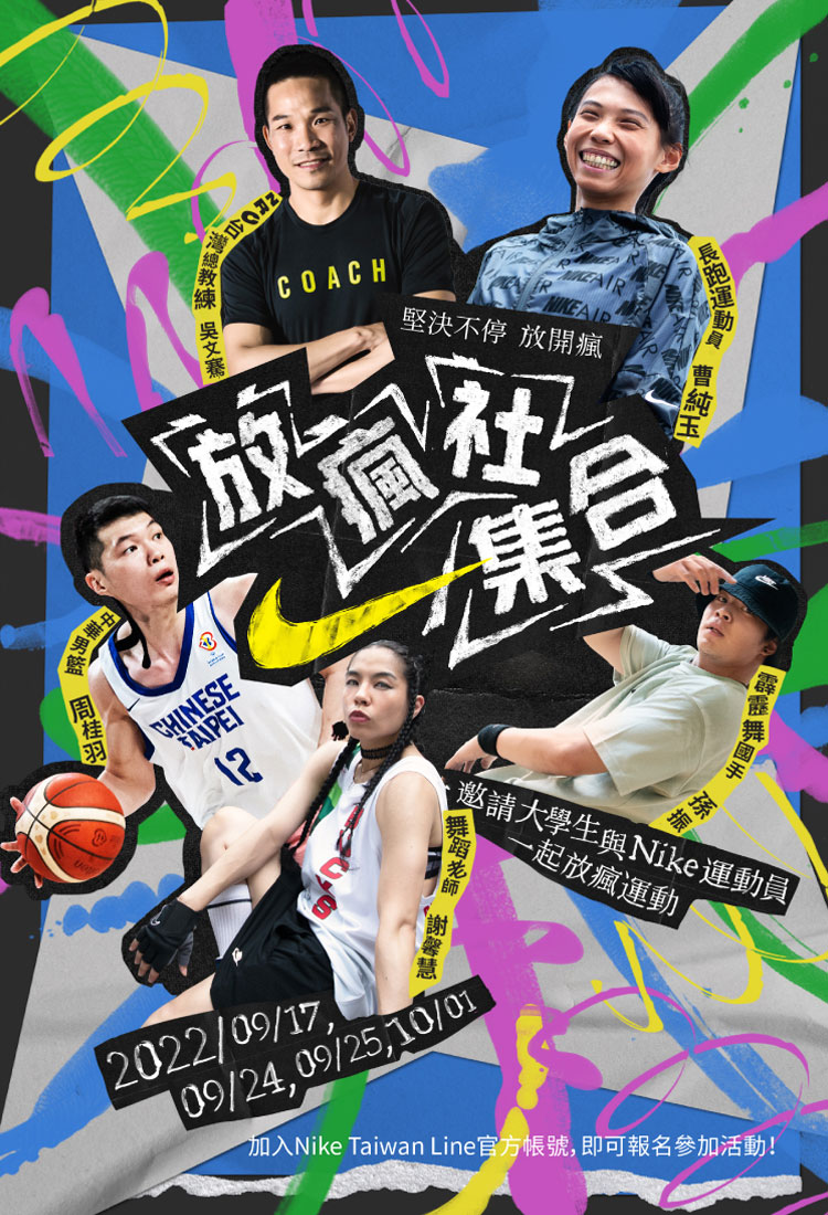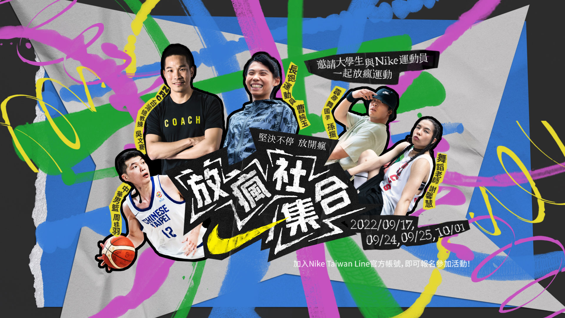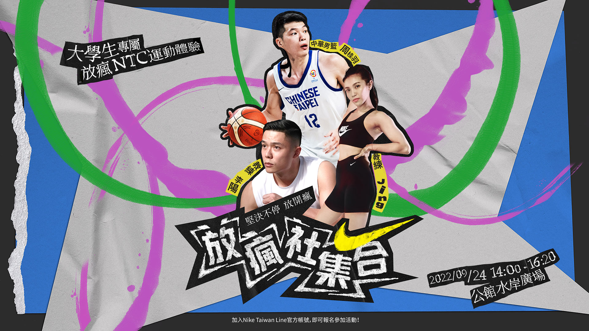請大專院校學生與Nike運動員一起放瘋運動!活動中將跟著Nike Trainer進行NTC訓練,以及中華男籃周桂羽、指有雞飯負責人Bobby的故事分享,讓身體動起來、放瘋想像,一起體驗運動的快樂。