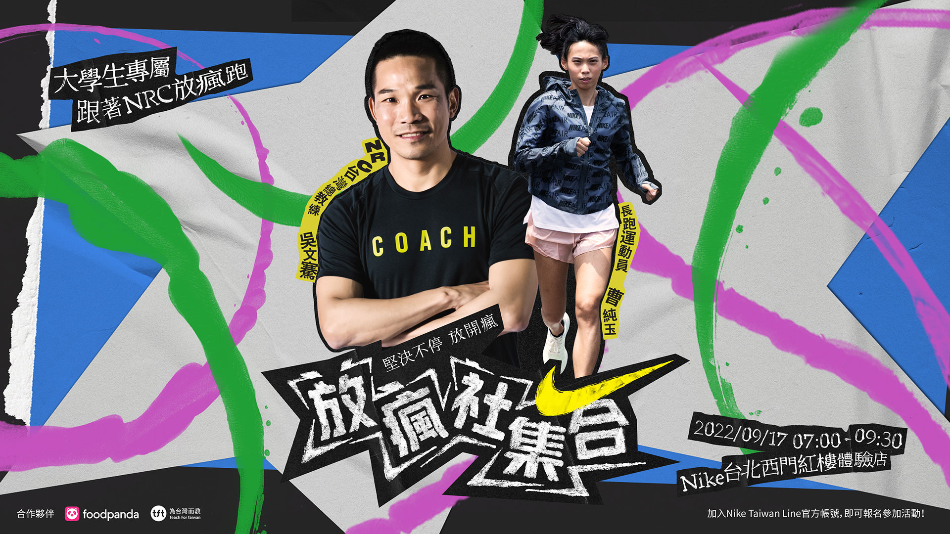 邀請大專院校學生、foodpanda的外送夥伴與Nike運動員一起放瘋跑!活動中將體驗到NRC HOME RUN,以及長跑運動員曹純玉、NRC台灣總教練吳文騫與為台灣而教計畫成員的故事分享,一起放瘋身體、放瘋思考,與大專院校學生們一起體驗跑步運動的美好。