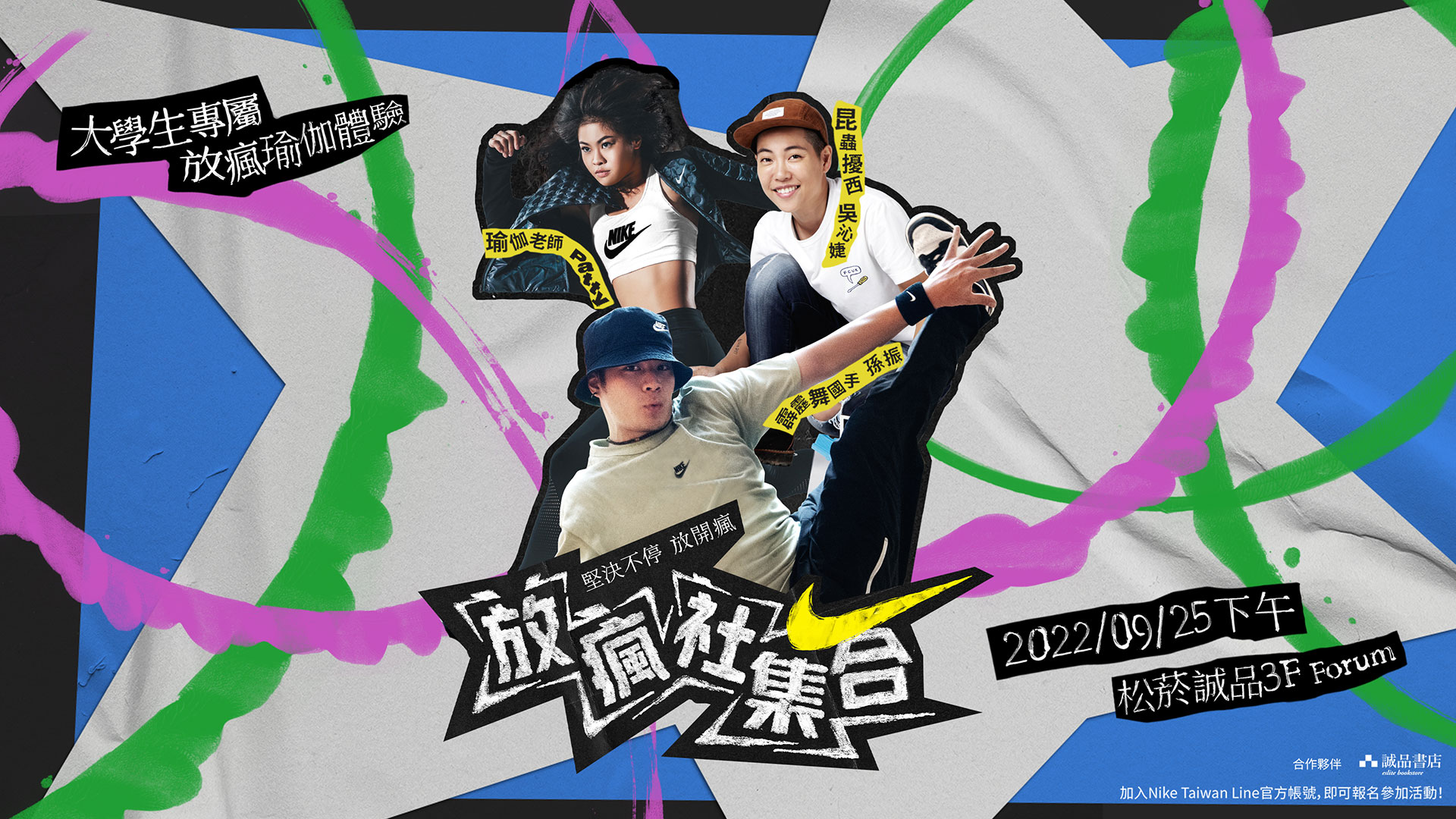 邀請大專院校學生與Nike運動員一起放瘋瑜伽!活動中將由Nike Yoga Trainer帶領瑜伽訓練,以及霹靂舞國手孫振、昆蟲擾西吳沁婕的故事分享。一起探索身體、沈澱心靈,放瘋對未來的想像,體會運動帶來的力量。