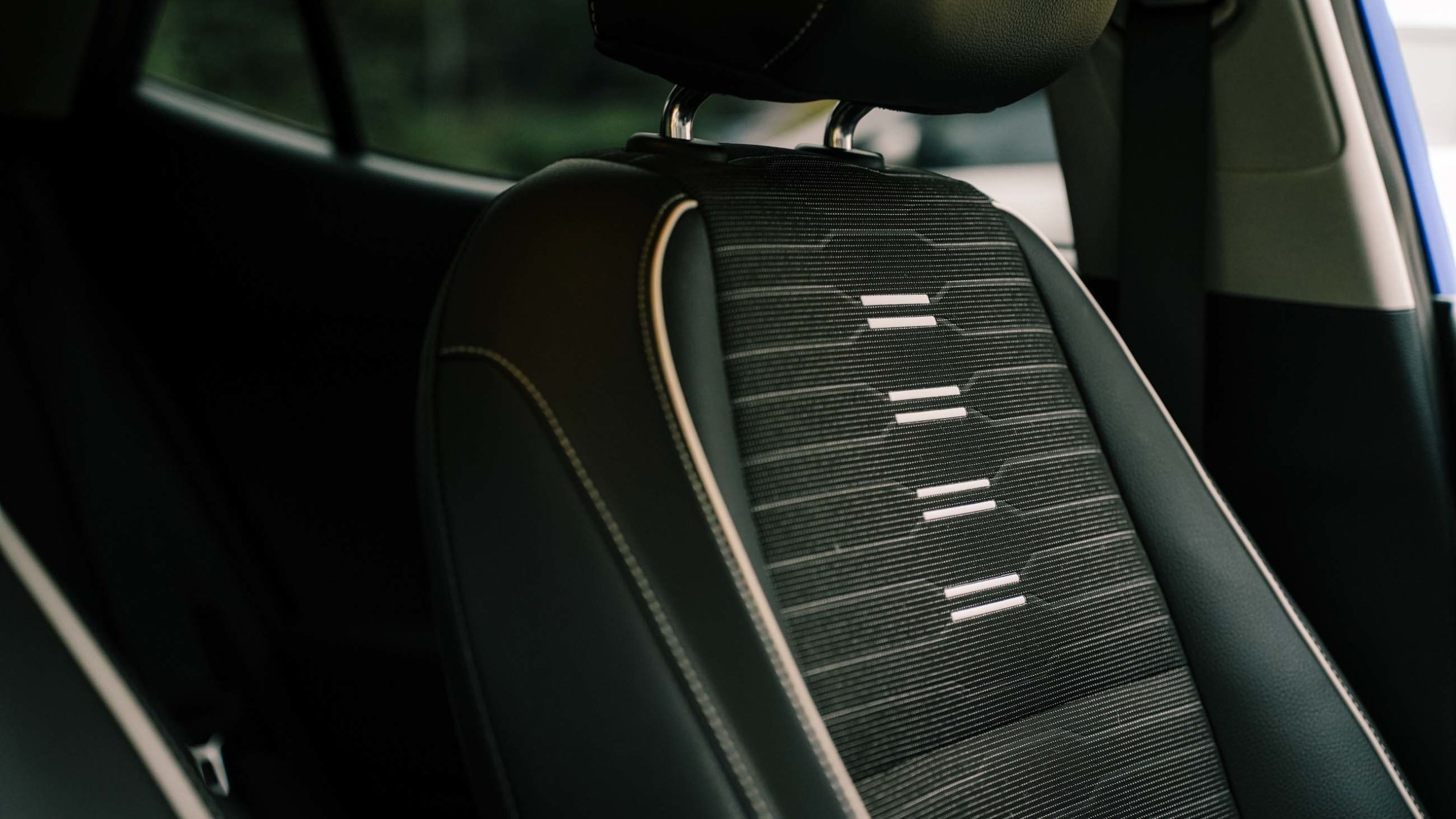 運用相異材質堆砌出 Stonic 1.0T GT-Line 獨有的車艙氛圍,這裡指的「相異材質」包括但不限於中控台上的類碳纖維飾板,以及所謂 D-Cut 式樣的 GT-Line 平底方向盤,甚也可以將座椅的設計一起納入討論;皮、布複合材質的使用在觸感上算是中規中矩,支撐性不會太差,而取自和水箱護罩相同概念的 Tiger Nose 紋路嘛 … 需要稍微意會一下,但似乎有點意思。