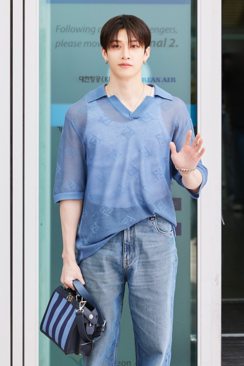 Bang Chan 身穿FENDI 淺藍色 FF 緹花設計 Polo 衫、搭配經典藍色牛仔褲,並肩背由 Cuoio Romano 皮革製成、帶有品牌標誌性藍色 Pequin 條紋的 Mini Peekaboo ISeeU 包,為整體造型增添奢華感,並搭配設計銀飾強化整體造型層次感,展現時髦且寫意的 FENDI Man 穿搭風尚。