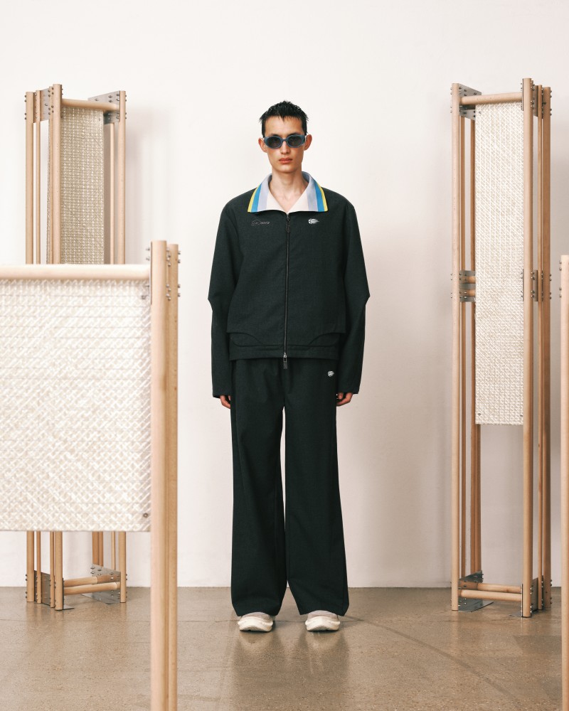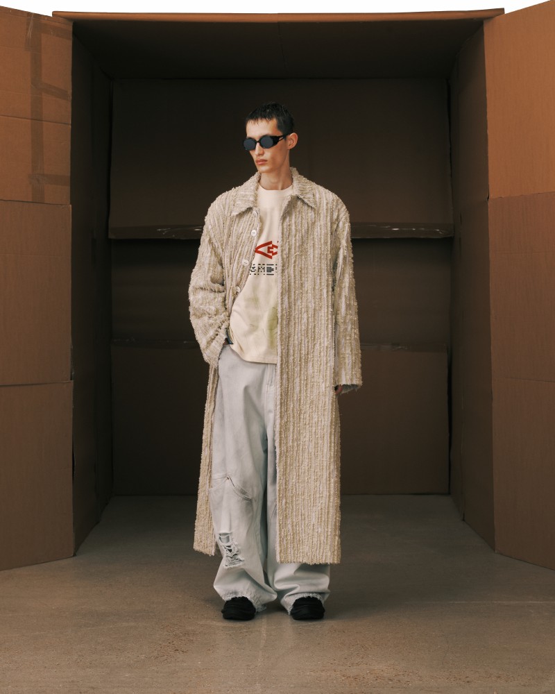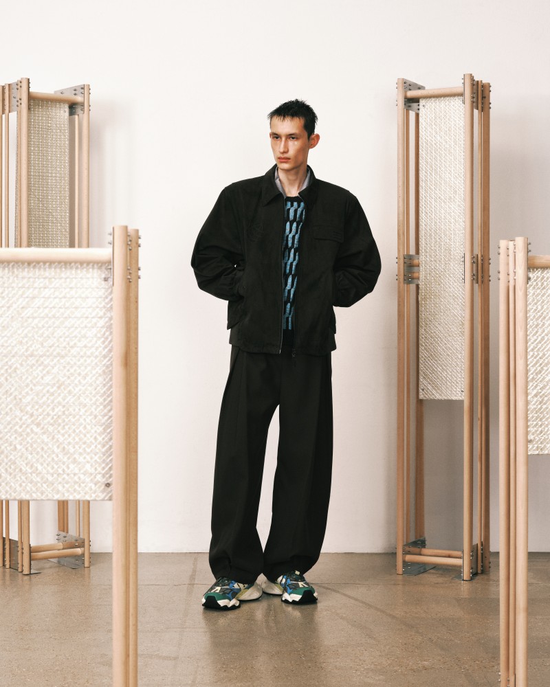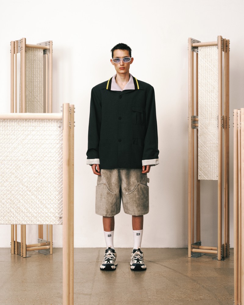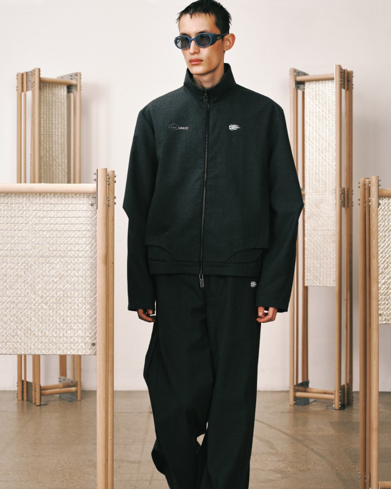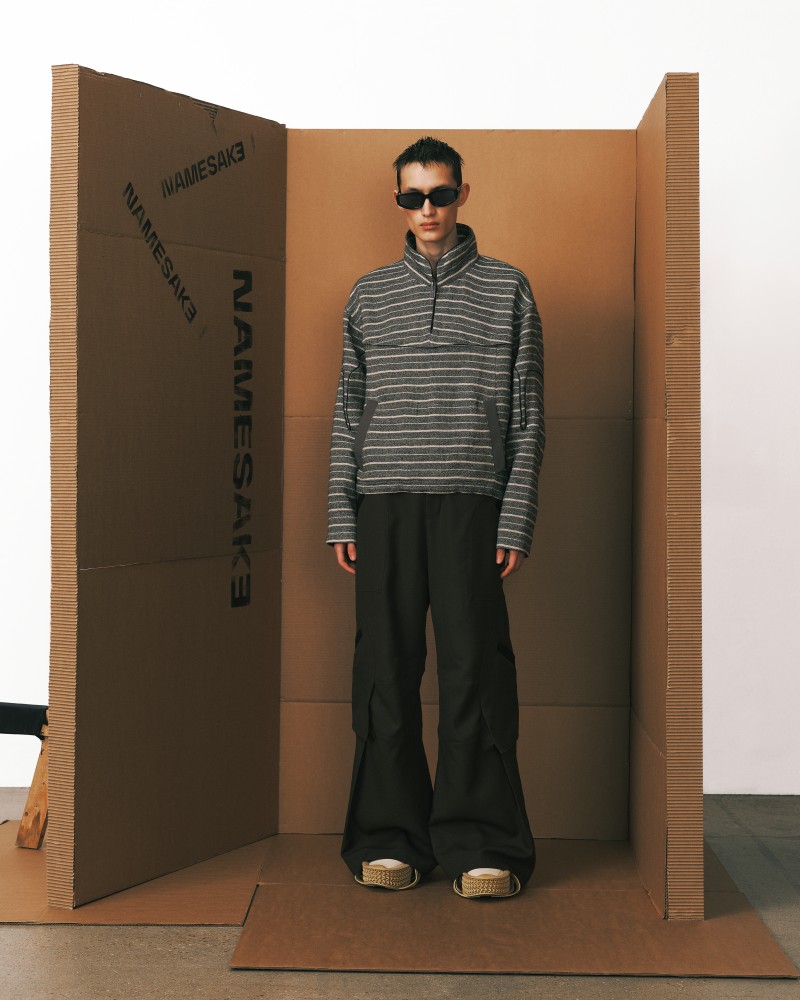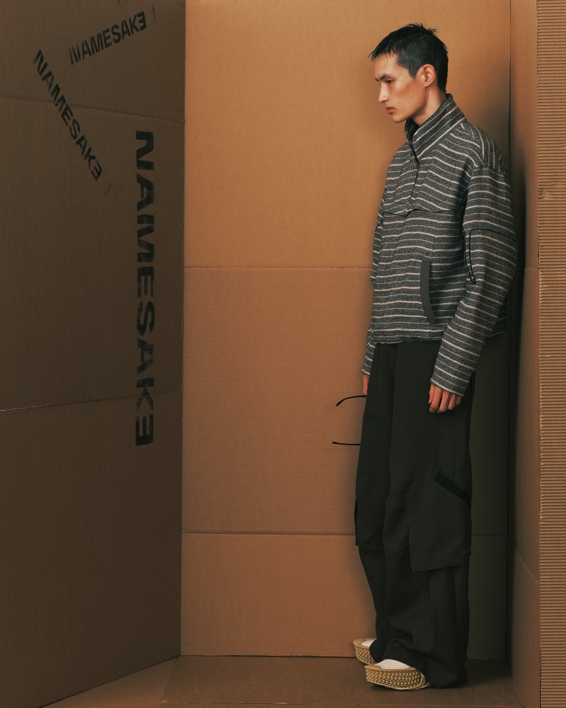 本系列受到 Kevin Garnett 和 David Beckham 等標誌性運動員的啟發,將運動服裝升華為精緻的作品,捕捉不懈追求與快速適應的精神。NAMESAKE 選用舒適且熟悉的材質——如仿麂皮面料和光澤絨緞,讓人聯想到溫馨的傢俱,並搭配亞麻結合紋理,帶來如浴袍般的舒適感。仿污漬和水洗技術展示了時間與經驗的痕跡,而手工帆布面料則呼應了搬遷過程中的磨損。每一個設計細節都體現了過渡的觸感與情感,展現出沿著人生的藍圖邁進的從容與堅韌。