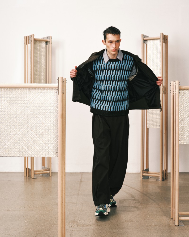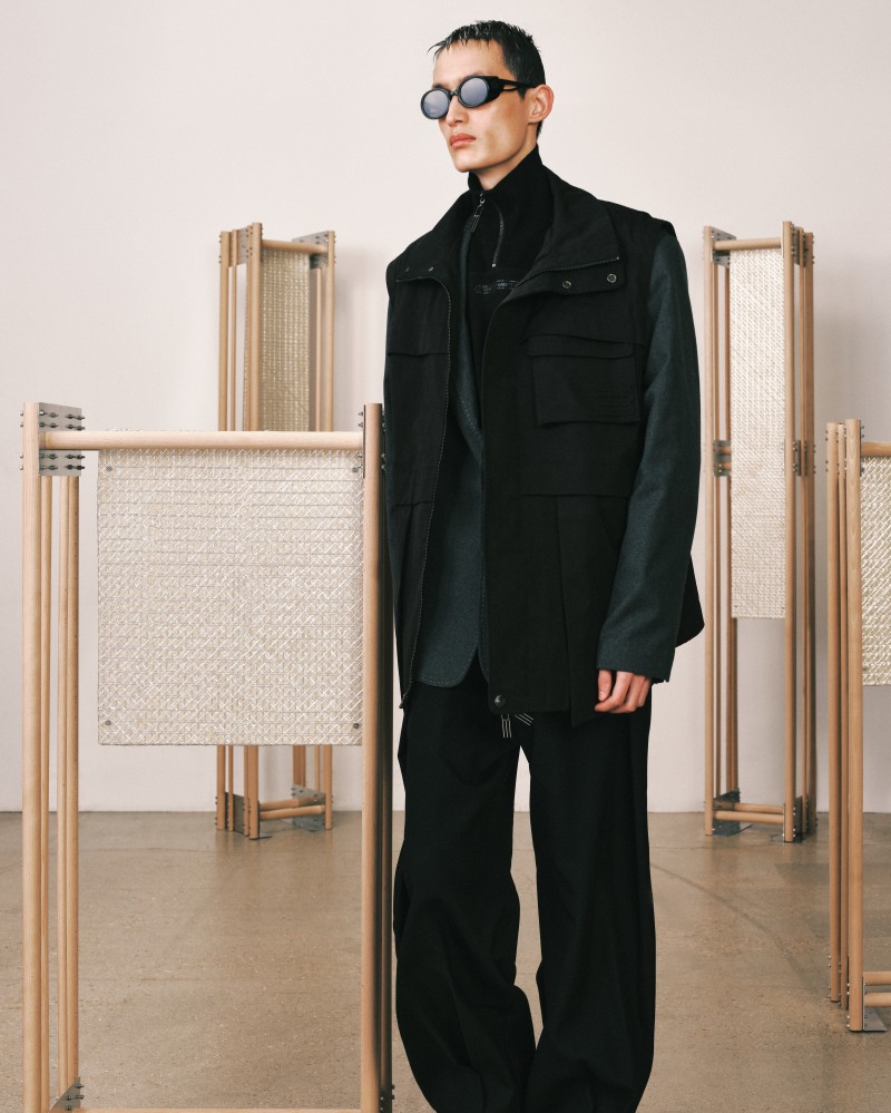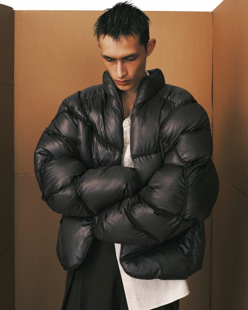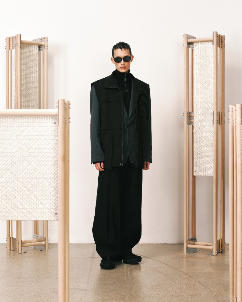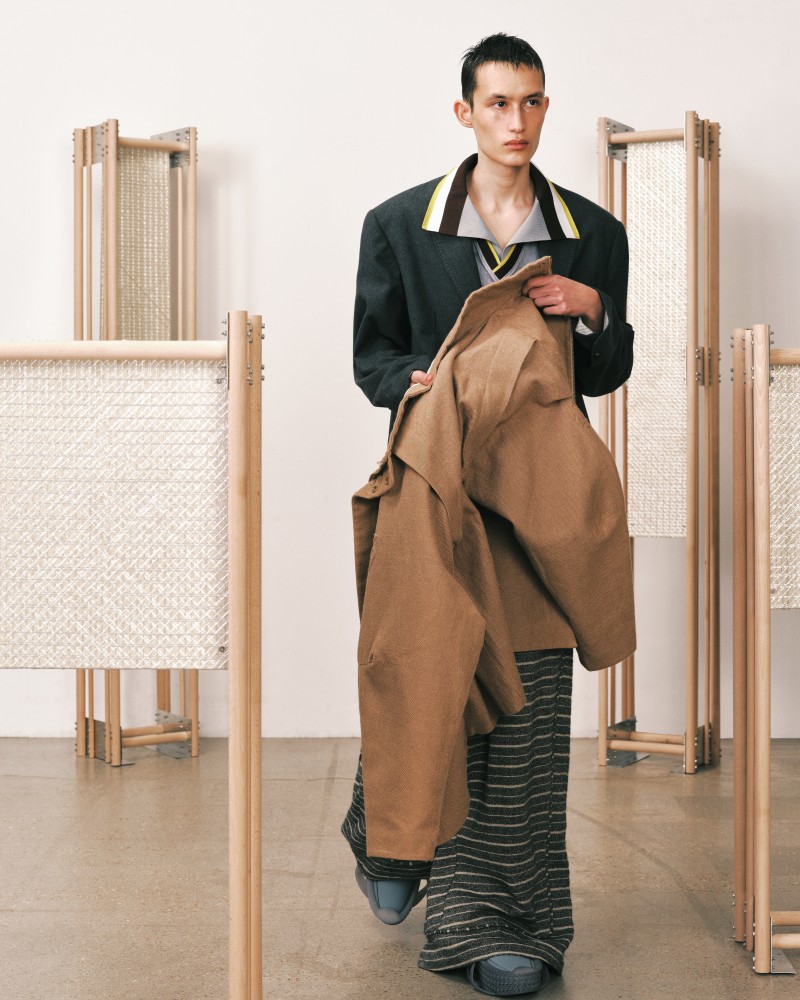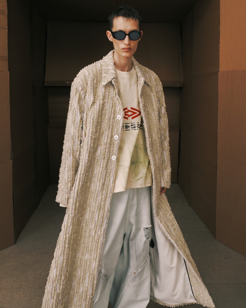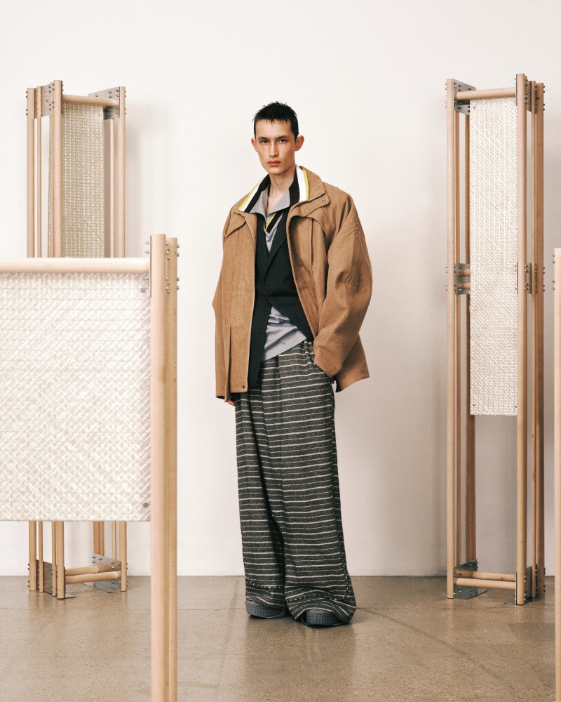 本系列受到 Kevin Garnett 和 David Beckham 等標誌性運動員的啟發,將運動服裝升華為精緻的作品,捕捉不懈追求與快速適應的精神。NAMESAKE 選用舒適且熟悉的材質——如仿麂皮面料和光澤絨緞,讓人聯想到溫馨的傢俱,並搭配亞麻結合紋理,帶來如浴袍般的舒適感。仿污漬和水洗技術展示了時間與經驗的痕跡,而手工帆布面料則呼應了搬遷過程中的磨損。每一個設計細節都體現了過渡的觸感與情感,展現出沿著人生的藍圖邁進的從容與堅韌。