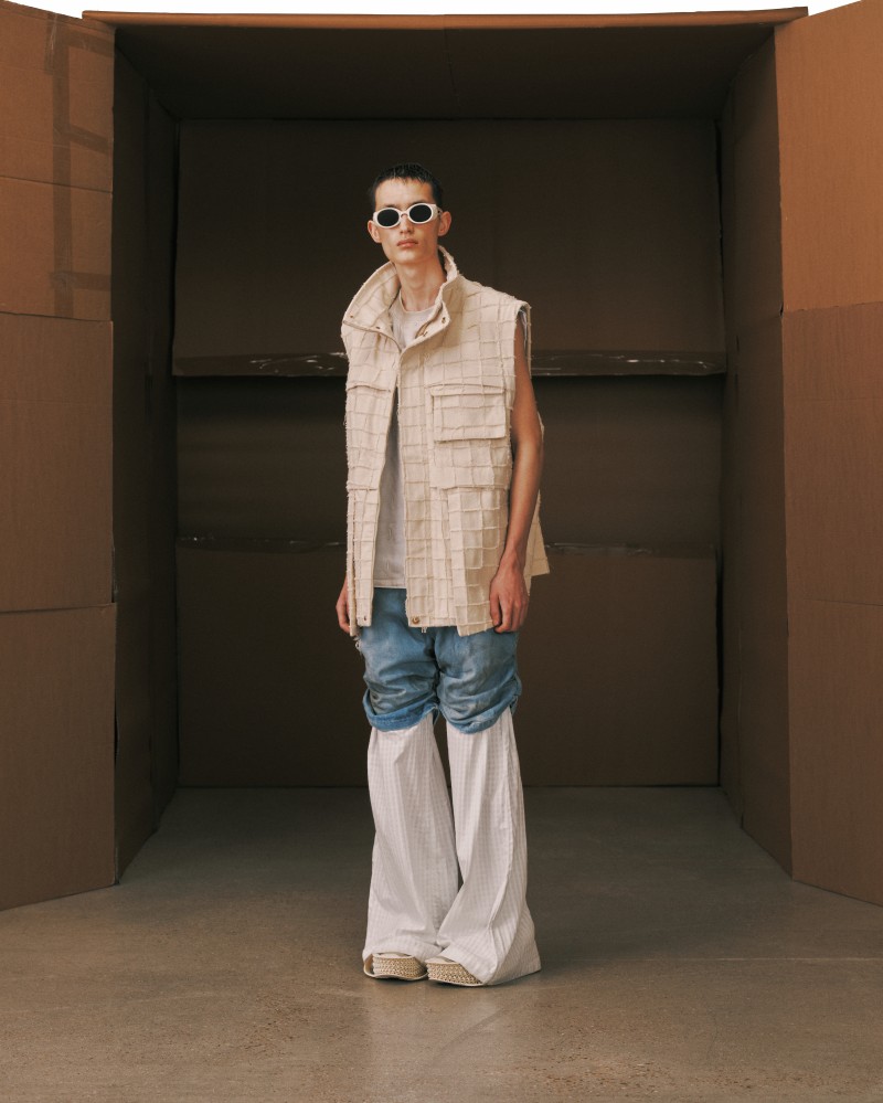 本系列型錄設計了兩個富有象徵意義的佈景,將紙箱和施工場地這些通常粗糙的意象轉化為精緻的藝術裝置,深刻詮釋了系列的核心主題。第一個佈景是以巨大紙箱打造的類房間空間,象徵著整理過去並為未來做準備的過程。這個象徵性的紙箱完美捕捉了搬遷時整理回憶和迎接變化的精髓,展現了從一個階段到另一個階段的過渡。模特兒在這個超現實的場景中穿梭,展現了迎接新開始所需的優雅與堅韌。
