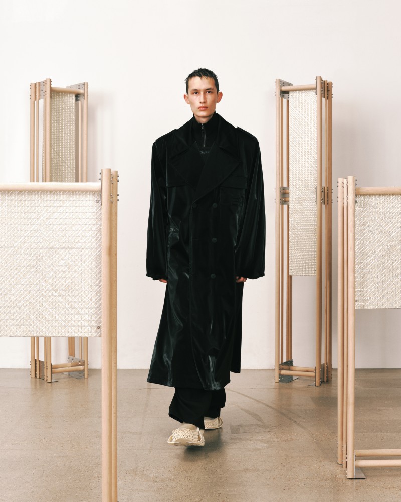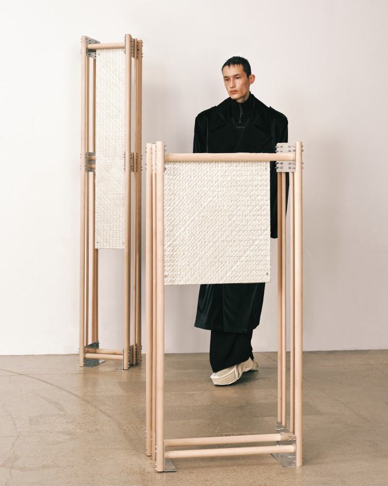 接著,從搬遷中的紙箱轉至第二個佈景——NAMESAKE 秋冬 2024 大秀的秀場裝置。此裝置將自然紋理與鋁材、玻璃纖維網等工業元素巧妙結合,創造出和諧的對比,象徵著施工地和重新構思的家居空間。這兩個佈景共同體現了系列主題,全面反映了搬遷過程中的情感與實際面向。