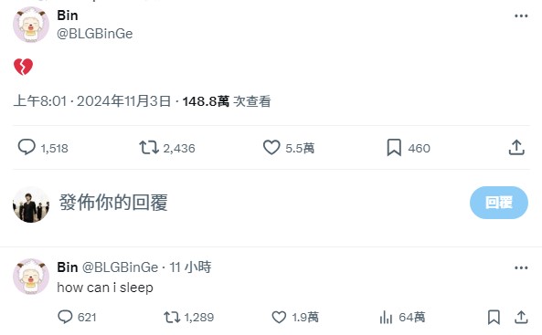 後來 Bin 也在個人微博發文表示:「對不起,就差一點點,永遠尊重 Faker,永遠尊重 T1。」另外在他的推特上也發了一個心碎的 Emoji。