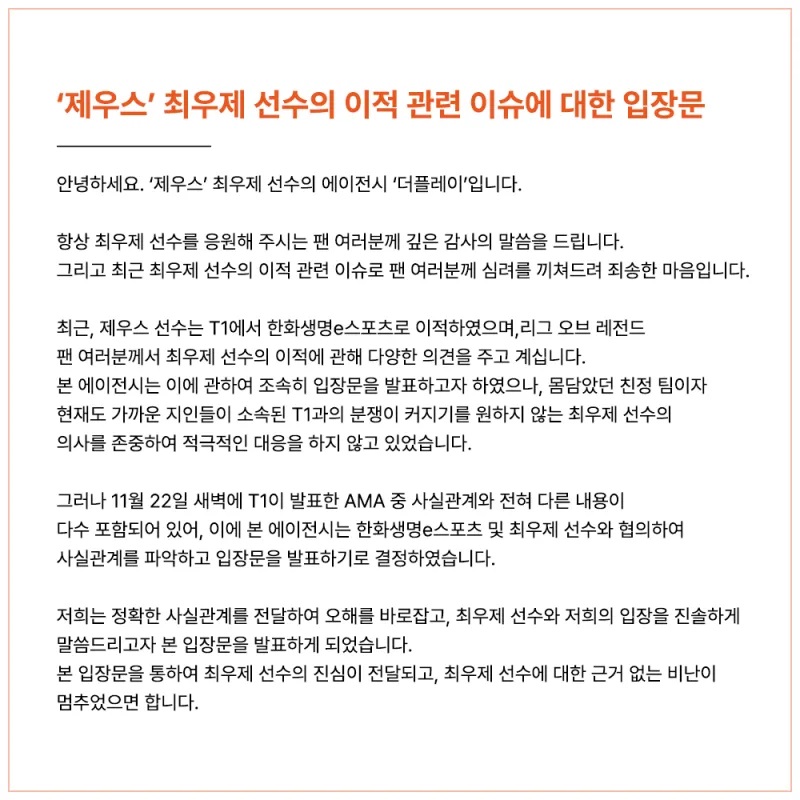 - THE PLAY 表示,Zeus 作為一名從青訓生時期開始就只效力於 T1 的選手,對 T1 的忠誠心和愛意非常與眾不同,即使承受損失也要留在 T1 是其最優先的目標。Zeus 也向本經紀公司傳達了這一點。