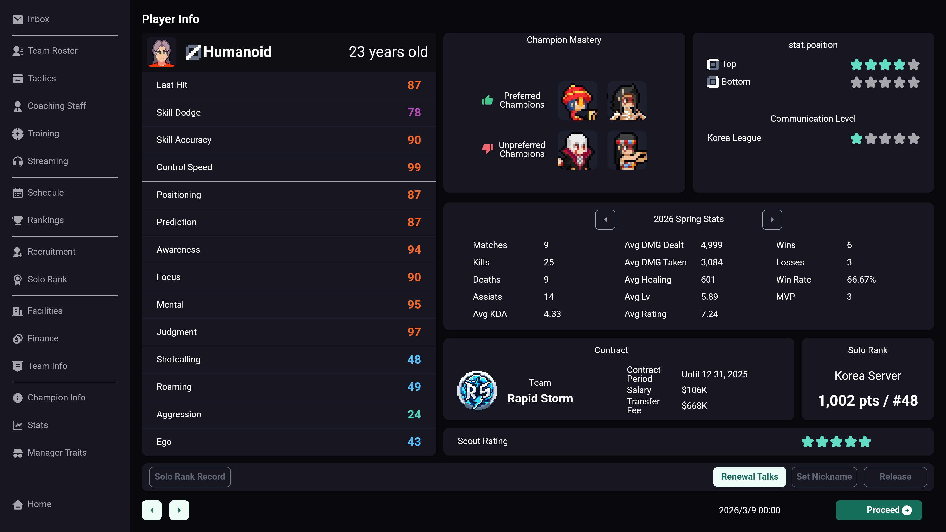 身為電競經理人的你需密切關注「素人們的單排比賽」和「其他戰隊選手」的表現,以發掘並招募優秀選手!每位選手的能力各不相同,並會對比賽產生重大影響。你可以透過談判以較低的成本招募優秀選手,來更有效率地運營自己的戰隊!