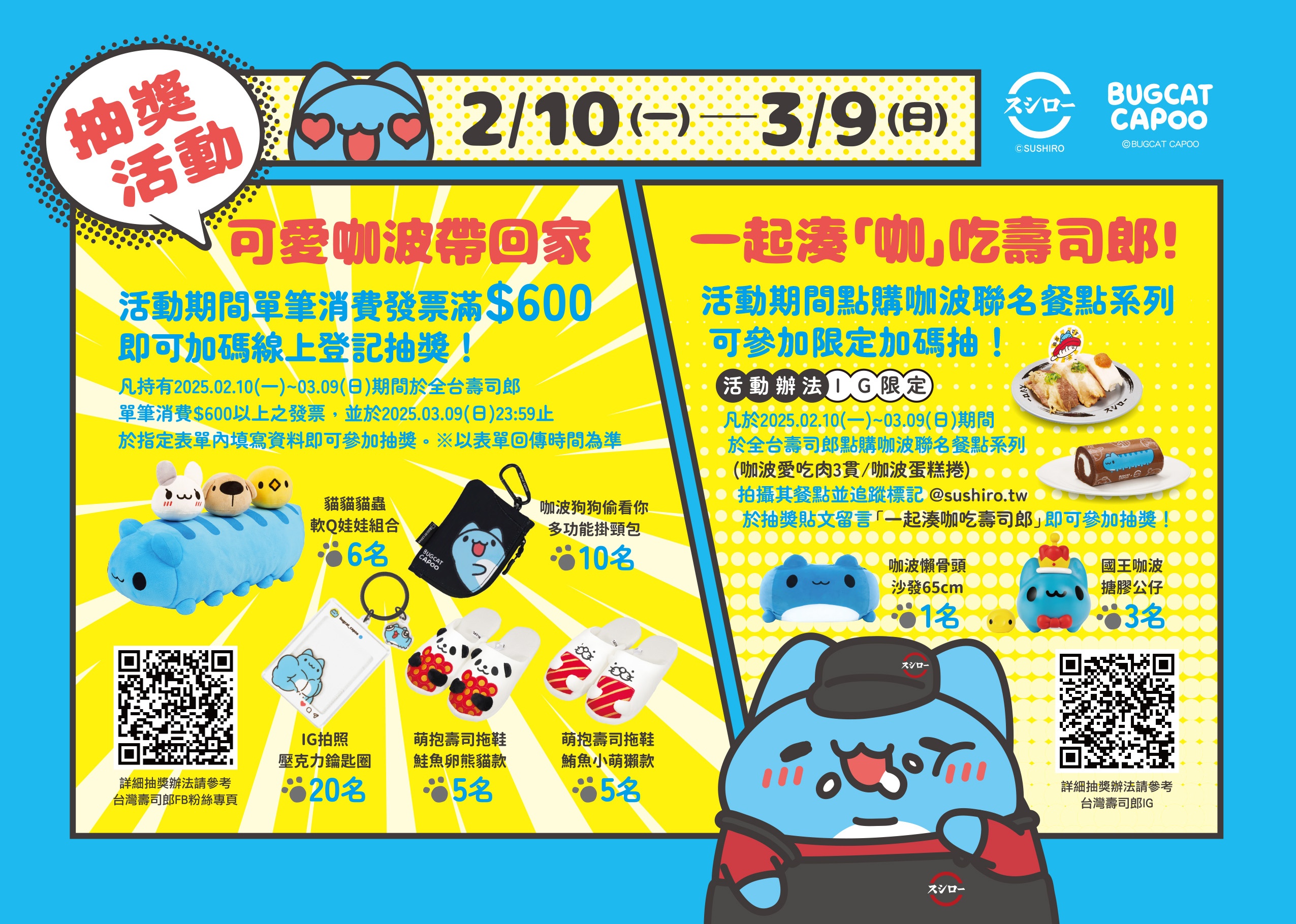 壽司郎自2月10日(一)起至3月9日(日)台灣原創IP《貓貓蟲咖波》攜手展開為期28天的聯名活動。《貓貓蟲咖波》將化身成為壽司郎店長,與壽司郎攜手推出2款獨家餐點,更精心規劃了2波的滿額贈、加價購活動,絕對滿足咖波鐵粉的收藏慾!