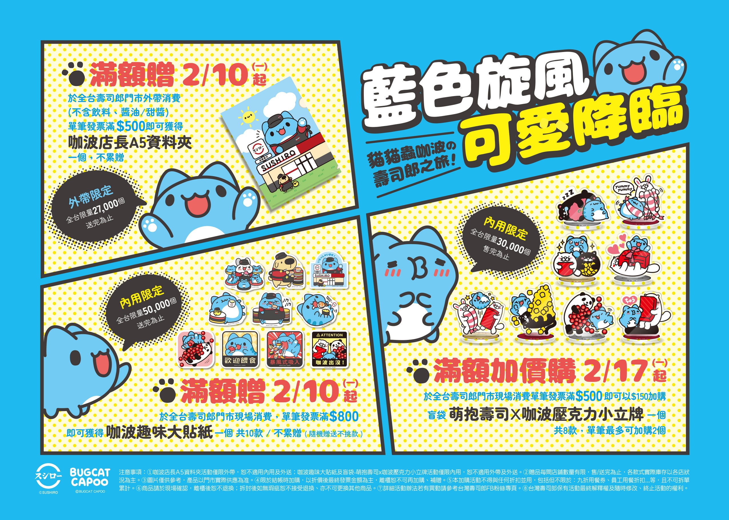 外帶限定滿額贈活動同樣於2月10日(一)起,至全台壽司郎外帶單筆發票金額滿500元(飲料、醬油、甜醬除外),即可獲得「咖波店長A5資料夾」乙個(不累贈)。全台限量27,000個,數量有限送完為止。