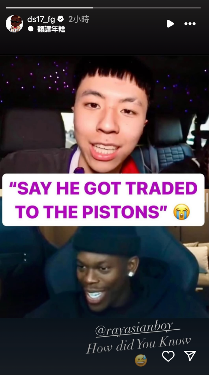 日前「國民外交官」Ray 才在直播中惡作劇 Dennis Schröder ,要大批網友去直播底下狂刷他會被交易到活塞的留言,沒想到如今 Dennis Schröder 真的到活塞,Schröder 還在限動中標記 Ray,打趣說道:「你怎麼會知道?」