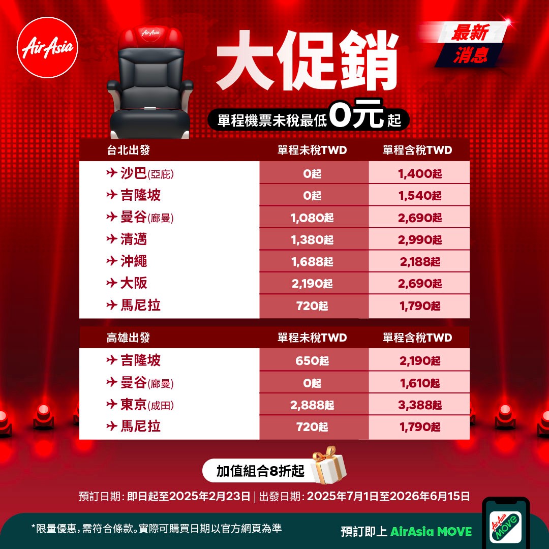 AirAsia 2025 年第一檔大促銷將於 2/15 中午 12:00 開搶,優惠至 2/23,適用旅行期間為 2025/7/1 至 2026/6/15。