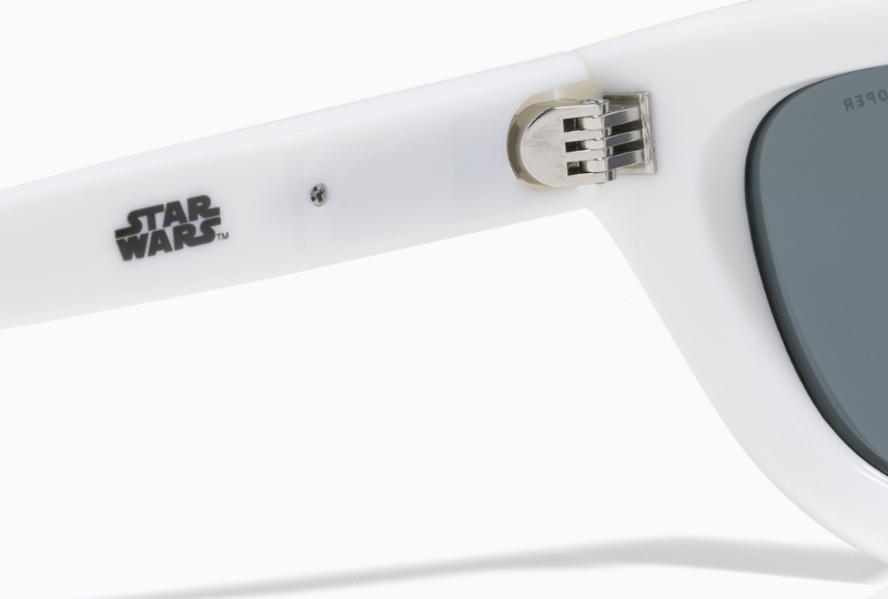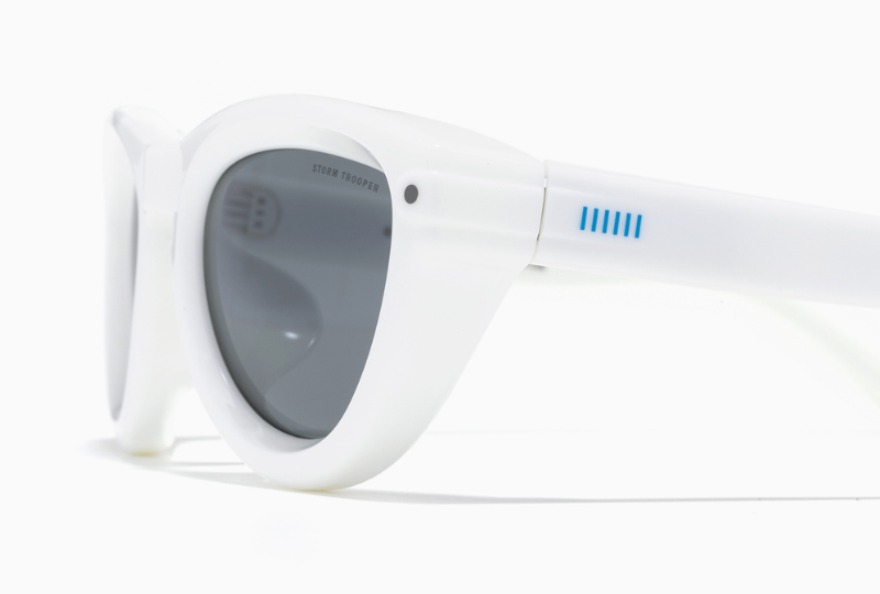 同樣在流線框架下成型的「帝國風爆兵款」,鏡片上緣雕刻隱密細緻的雷射字句,最值得我們賞玩的地方就是鏡腳側邊的風暴兵面具藍線,以及鏡框正面的黑圓點設計!看似細微的小小設計,不但讓星戰老粉絲一眼就能看出致敬端倪,那一抹經典復古味兒,平時戴在路上也會讓非粉絲的路人驚嘆:「哇~這人真懂戴!」~