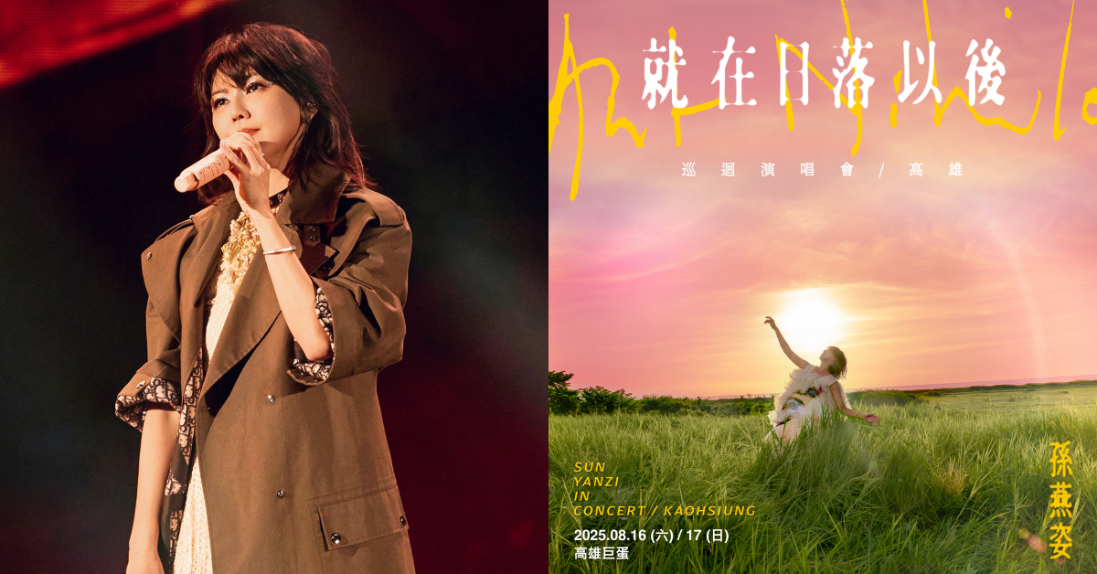 「天后」孫燕姿慶祝出道 25 周年巡演《就在日落以後》,所到之處門票場場秒殺,網友們欣喜若狂歡呼:「最期待的演唱會!」在台灣歌迷們的千呼萬喚、眾所期盼聲中,終於等到今天官方正式宣佈重磅喜訊! 孫燕姿將於 8/16-17 登高雄巨蛋開唱,這也是孫燕姿出道以來首度攻唱高雄巨蛋!