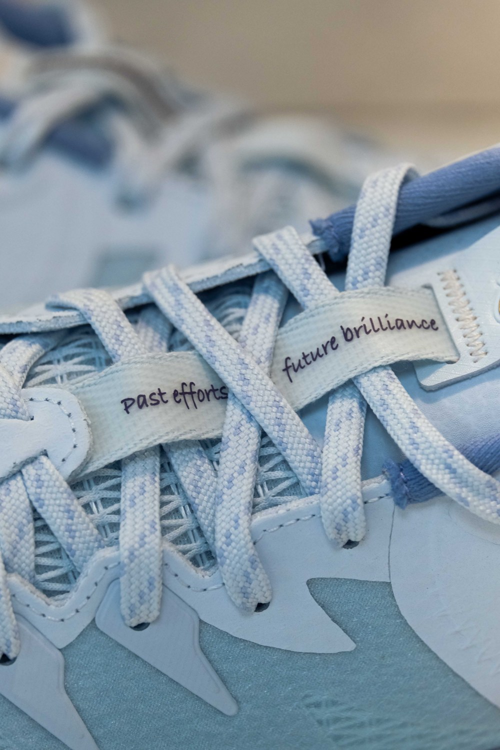中間鞋舌前方印有「Past efforts, future brilliance(過去的努力,成就未來的光芒)」,勾勒出河村勇輝這些年不斷勉勵自己的信念。後跟一邊用刺繡繡上日本國旗上的金太陽,另一邊則是河村自己的簽名,不管人身在何處,絕對都不能忘記初衷與故鄉。