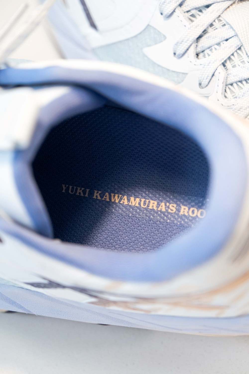 後跟處還藏著一個令人會心一笑的小巧思,如同樹葉陰影般的剪影圖樣,靜靜浮現在鞋身。這正是河村勇輝童年時期,在後院練球時常見的景象:午後陽光穿過枝葉灑落地面,陪伴他一投再投。這片斑駁的光影,既是成長的背景,也是他逐夢的證明。