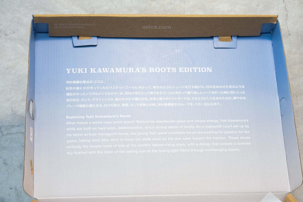 ASICS UNPRE ARS LOW 2 RT「河村勇輝限定款」不僅配色與細節上別出心裁,連鞋盒也圍繞在河村勇輝籃球的夢想初心:「河村勇輝的原點,就在這裡。在自家後院由父親搭建的籃框前,他每天反覆練習投籃。那片像夕陽染紅的天空一樣溫暖的漸層色調,是他童年時,日落時分努力投籃時最熟悉的風景。鞋面顏色,取自那片天空;而鞋身圖騰,則象徵樹葉間灑落的光影。