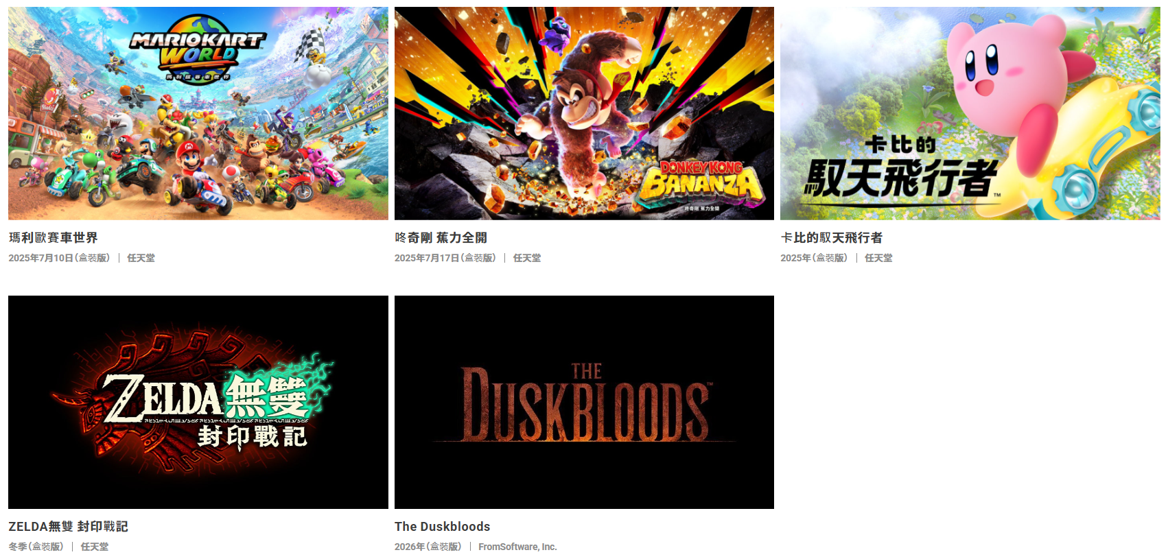 跟隨 Nintendo Switch 2 首發上市的新作就是《瑪利歐賽車世界》,隨後還會有《咚奇剛 蕉力全開》(2025 年 7 月 17 日)、《卡比的馭天飛行者》 (2025 年內)、《ZELDA無雙 封印戰記》(2025 年冬季)、《The Duskbloods》(2026 年)等新作的獨佔推出。
