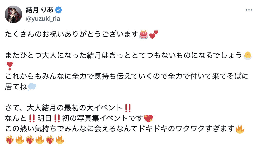 然而,在面對上粉絲們的爭相祝福,結月りあ 稍早便於 X(Twitter)發布貼文,寫下 “又長大了一歲的結月,今後一定會變得非常了不起🐣❣️今後我也會繼續全力地把心意傳達給大家” 等文字,表達出對群眾的感謝之情。另外值得一提的是,雖說透過不久前的貼文表示,結月りあ 貌似無緣今年的 TRE 盛會,但欲支持她的朋友,不妨也能關注起她的相關 SNS,越加抬升其的網路人氣!