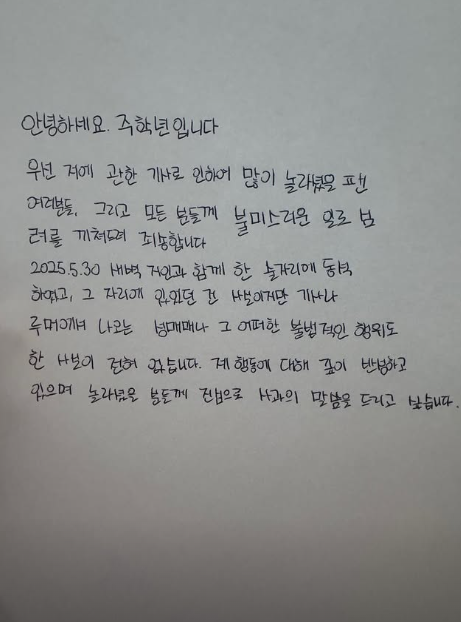 對此,周鶴年在深夜打破沈默,在社群發出手寫信道歉,並還原當時情況,「2025 年 5 月 30 日凌晨,我確實與一位熟人一同參加了酒局,也的確在那個場所出現過,但針對報導與謠言中所提及的性交易或任何非法行為,我完全沒有從事過這樣的行為。」他表示正在為自己的行為深刻反省中,並再次向所有人道歉,「想向因此受到驚嚇的各位,誠摯地道歉。」