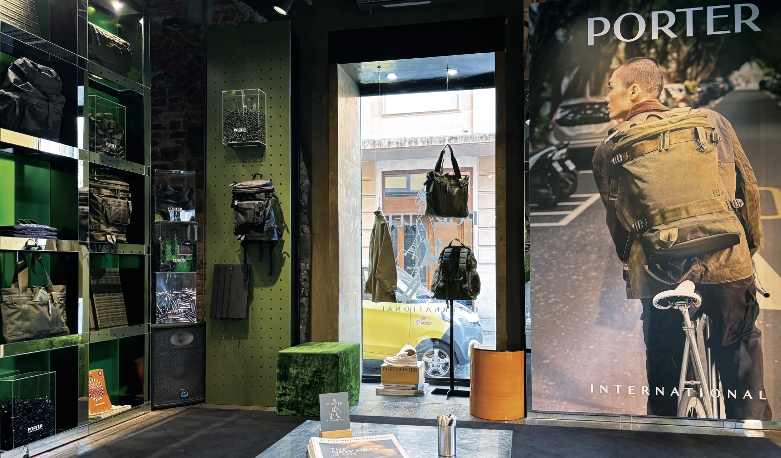 本次快閃店空間設計亦別具巧思,完整體現NEW HEAT系列世界觀。玻璃櫥窗的展示結合經典袋包與單車,營造城市探索氛圍,店內主調以森林綠色調陳列道具與磚牆,搭配柔和燈光,創造沉穩內斂的感官體驗。空間中也隨處可見NEW HEAT的標誌性元素如MAGLITE、安全帶式背帶等象徵性細節,傳遞系列獨特精神。