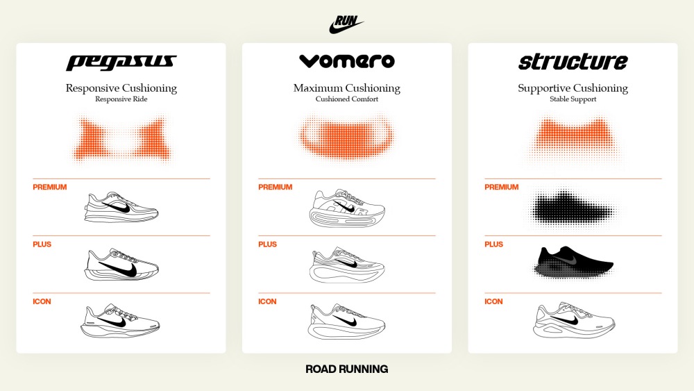 Vomero系列代表極致舒適的「超強緩震」體驗;Structure 系列強調穩定支撐;而 Pegasus 系列則以優異的回彈與緩震表現,打造全天候的能量回饋。