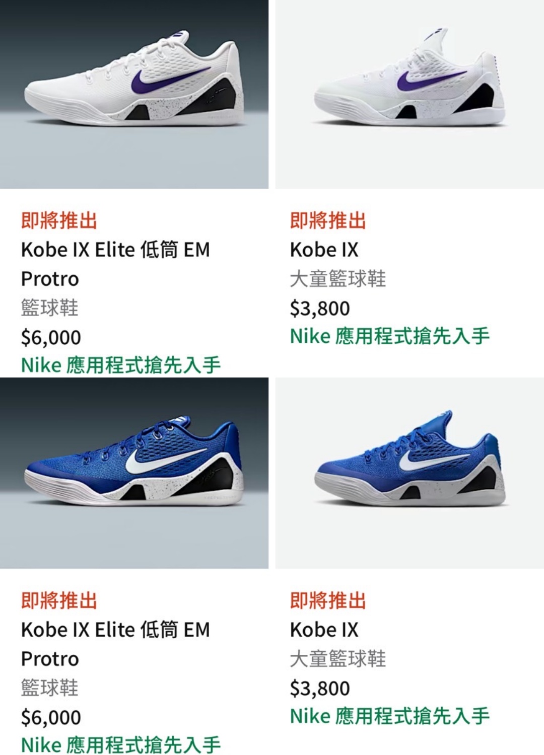 此外,同步上市的還有 Nike Kobe 9 EM 鞋款,與之前的八代配色相同,這次推出全黑配紫金的「好萊塢之夜」、「湖人主場白」、「大學藍」三款配色,不過台灣部分目前只有「湖人主場白」、「大學藍」兩款。全鞋搭載機能網布,中底則是 React 緩震泡綿,提供全方位的穿著體驗,在當年也是深受球友喜愛的實戰神鞋之一。