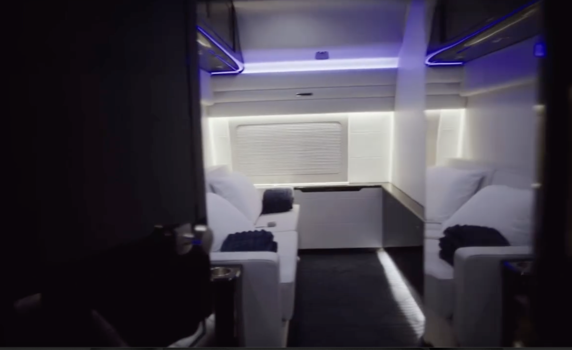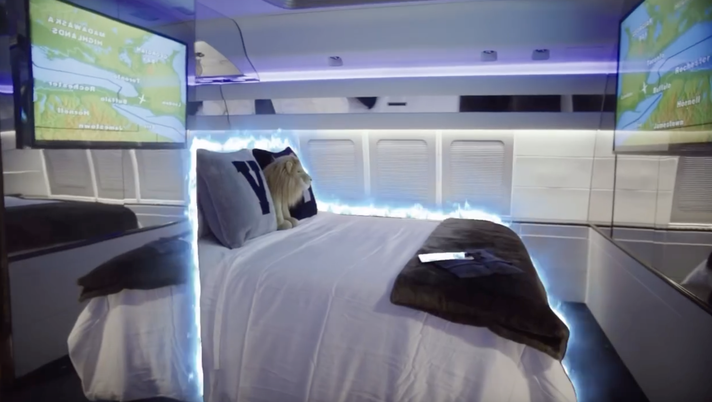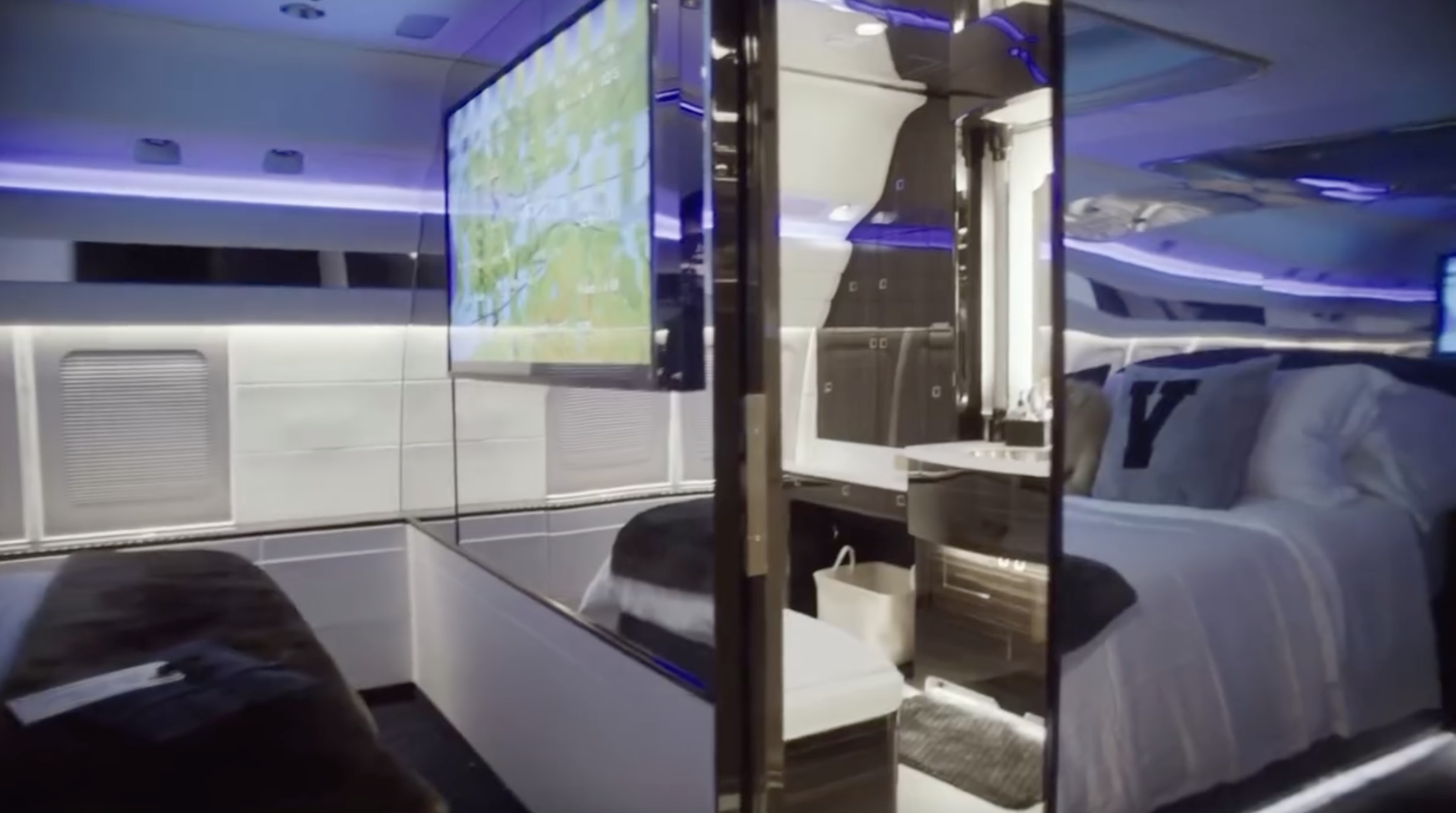 這架私人飛機過去就以浮誇外型聞名,現在內裝也全面升級:原本偏復古、帶點粉色調的設計,換上更冷調現代的風格,搭配紫色 LED 燈光,甚至還打造了一間專屬的電影放映室,專為長途旅行量身打造。此外,除了主臥外,還額外打造了三間客房,由此可知,飛機內的空間有多寬敞。回憶起這台飛機的誕生,Drake 曾說:「這可能是我人生中最瘋狂的時刻之一。我一開始根本不敢相信,直到 AJ 跟我說:『我要幫你搞到圈內最大的飛機,能跟你比的只有總統了。』」