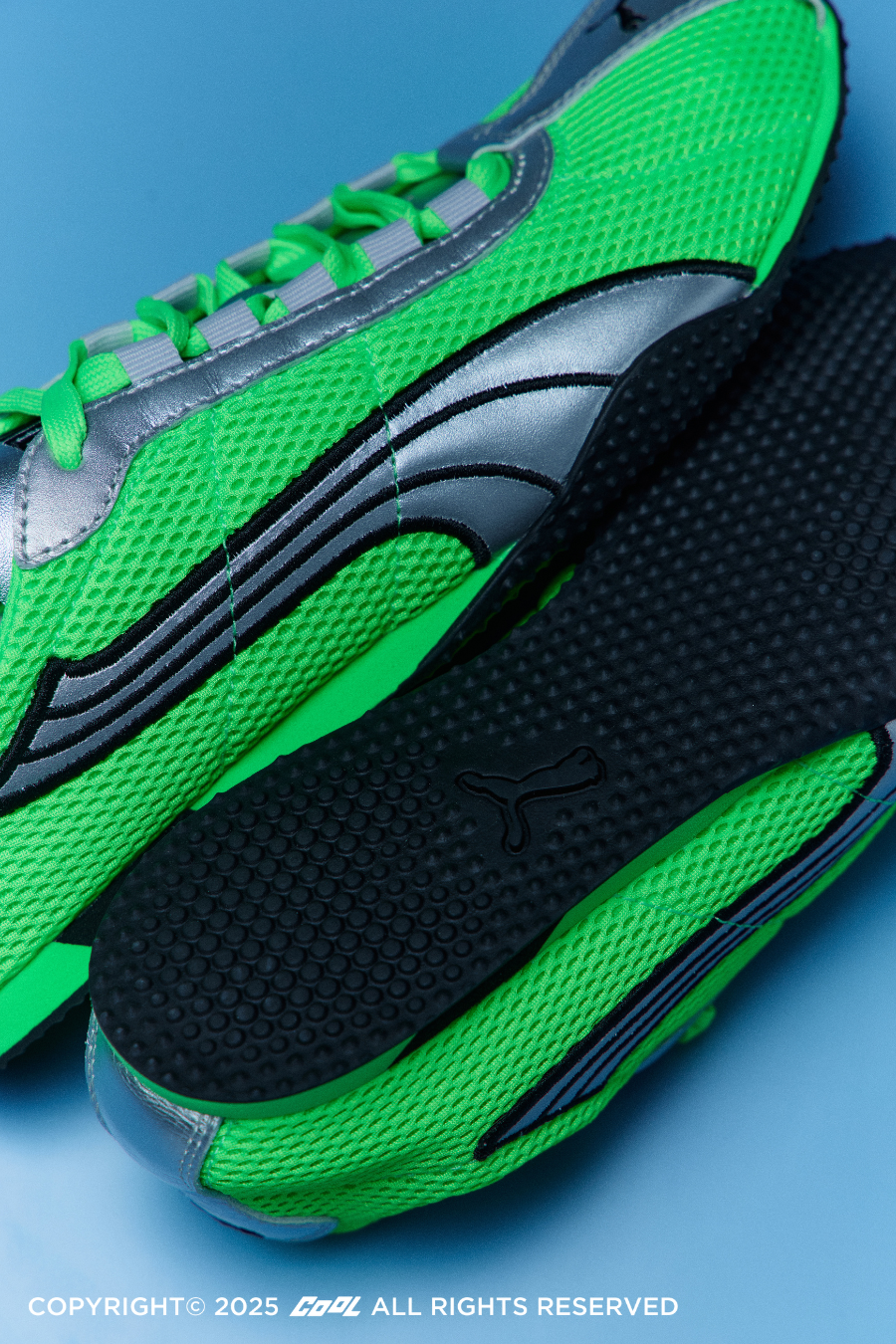 作為一雙源自田徑場的鞋,H-STREET 的結構從一開始就非常明確,元祖版本之所以打響名號,來自幾個關鍵元素:俐落簡單的鞋身線條、鮮明對比的配色,以及辨識度極高的大面積透氣網眼鞋面。它的原型來自 PUMA 的競速釘鞋,當時特別把原本適用於跑道的 PEBAX 釘板改為橡膠迷你顆粒外底,讓貼地、靈敏的腳感能夠帶進日常生活,也因此成為從賽道跨進街頭的重要設計。