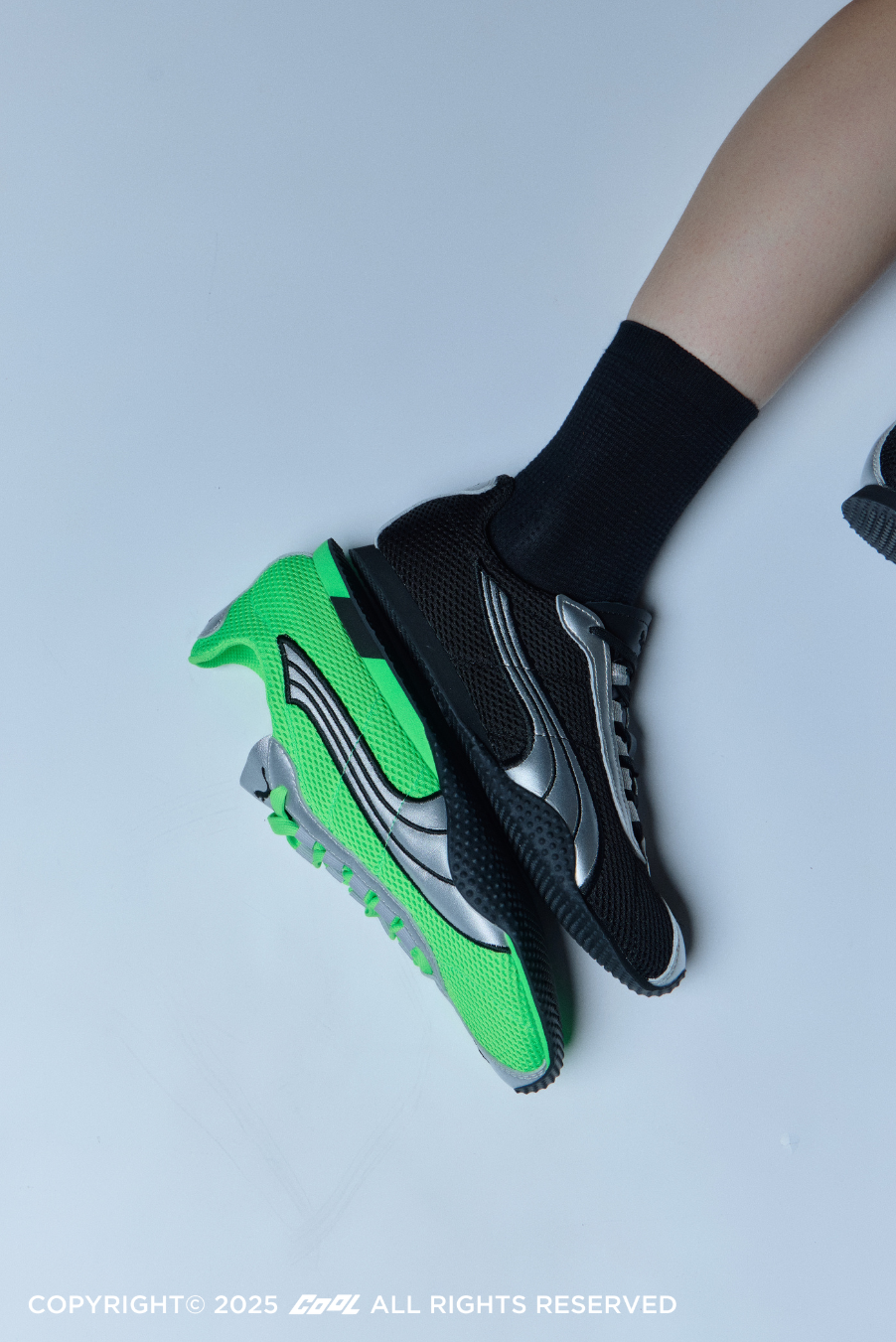 與螢光綠形成對比的是首次亮相的銀光黑,黑色網布與帶有微光澤的銀色彎刀層層交錯,相較於明亮的螢光綠,銀光黑的低彩度更能凸顯鞋身的線條和結構比例。