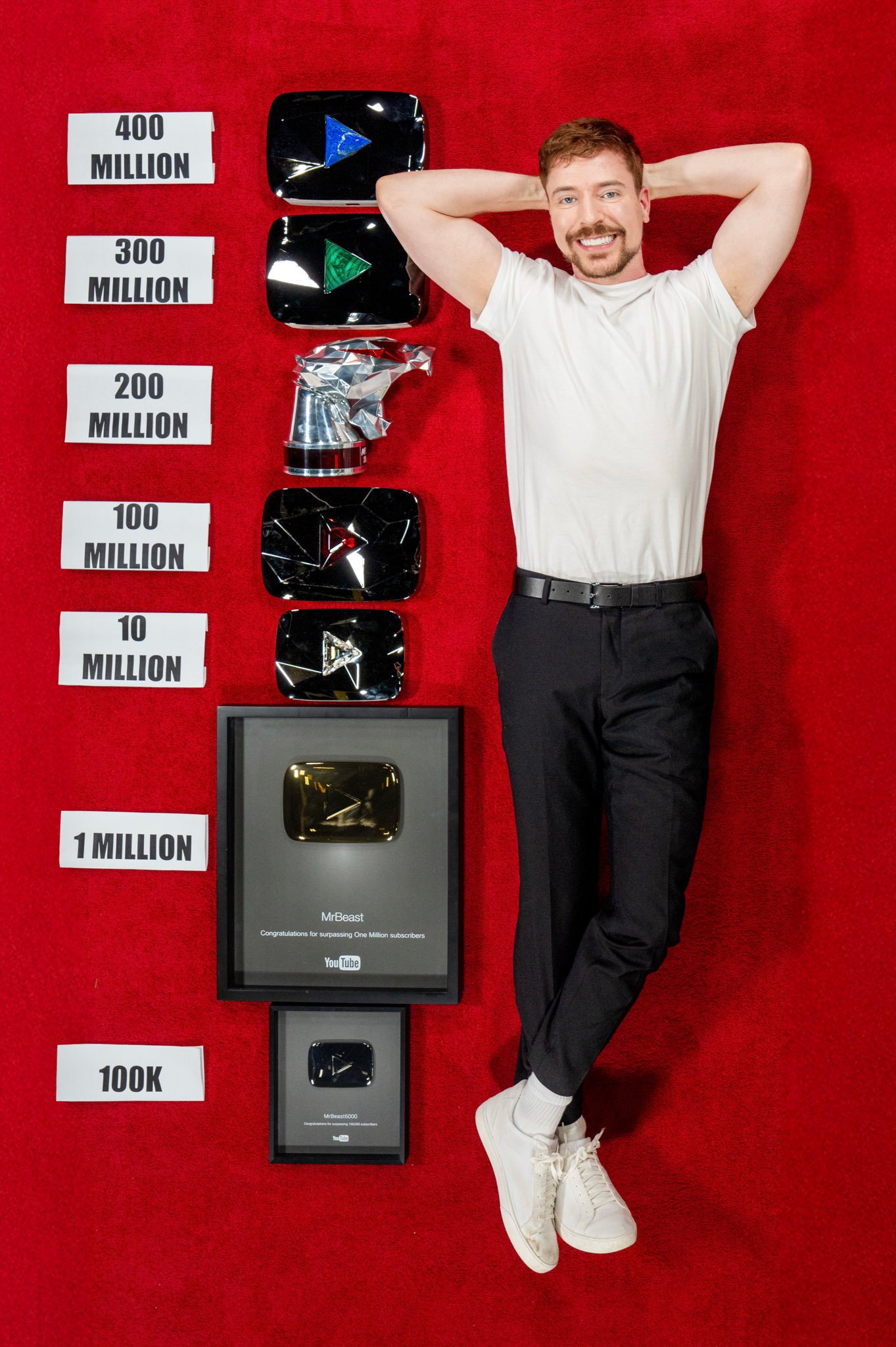 YouTube 為給予創作者獎勵及肯定,當訂閱人數到達一定門檻後,會贈送獎牌,10萬白銀級、100萬爍金級、1000萬鑽石級,台灣都有。這次全球訂閱數最多的 YouTuber MrBeast,則大方分享至今收到的所有訂閱者獎牌,尤其是 2 億的客製化獎盃,特別吸睛。