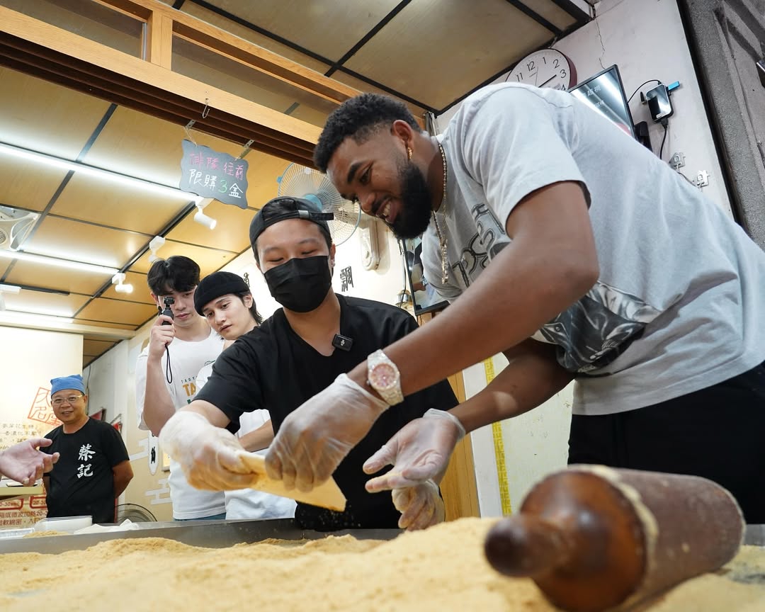 NBA 球星 Karl-Anthony Towns 昨(31)趁著參加珍珠海岸國際音樂祭的熱潮,旋風造訪傳統古樸的大溪老街,Towns 一路從欣賞百年牌樓、品嘗庶民小吃到挑戰陀螺,最後再親眼見識神將陣頭的震撼演出。而除了體驗台灣在地的人文風情與製作花生糖,Karl-Anthony Towns 還在「桃園盃全國三對三籃球賽」現場試寫書法,寫出:「三百首」對應他的中文翻譯名字唐斯,諧音起來就成「唐詩三百首」讓網友直呼太有梗。