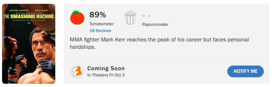 《The Smashing Machine》(中文暫譯:粉碎機)是由 A24 打造的傳記電影,由巨石強森艾蜜莉·布朗(Emily Blunt)共同主演,《原鑽》《失速夜狂奔》導演班尼·薩夫迪(Benny Safdie)執導。講述 MMA 格鬥選手、兩屆 UFC 重量級冠軍馬克·科爾(Mark Kerr)的故事。