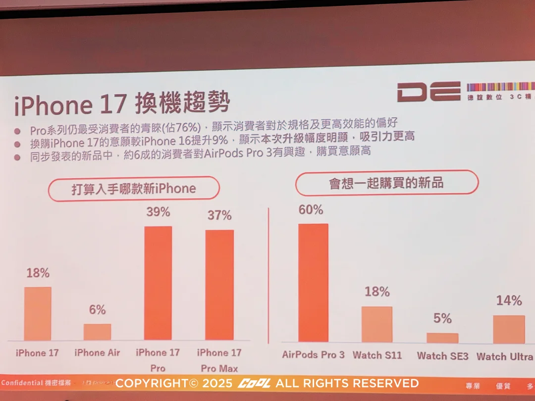 在四款新機中,iPhone 17 Pro 與 iPhone 17 Pro Max 最受青睞,分別有 39% 與 37% 的消費者表達購買意願;標準版 iPhone 17 則有 18%,全新超薄設計的 iPhone Air 僅獲 6% 青睞。討論度最高的「宇宙橙色」卻意外成為最不受歡迎的顏色。