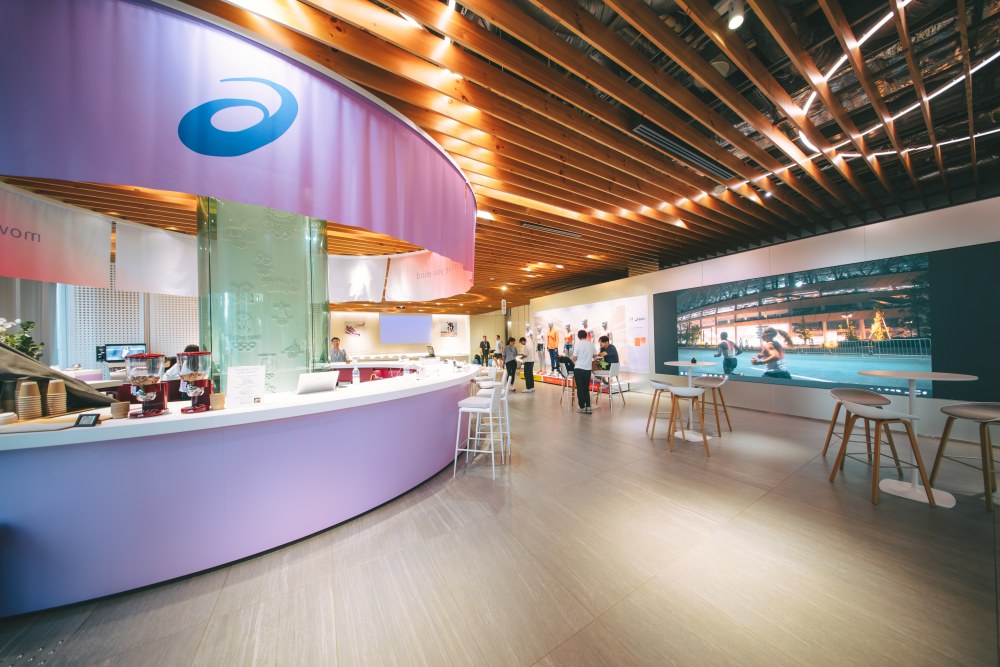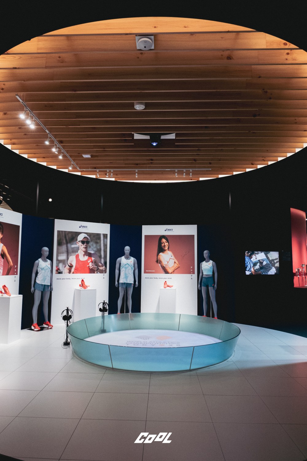 進入 ASICS House 先映入眼簾的是賽事主色調圍繞成的圓形座位區,上方的布簾隨風擺動,感覺上頗具日式風情。在這邊可以利用 VR 科技回顧五月的 TOKYO : SPEED : RACE,不論是跑道上的菁英跑者視角,亦或是旁邊吶喊應援團的角度,都讓人彷彿身歷其境般,賽道上的喘息栩栩如生,直接回味當時的熱血氛圍。