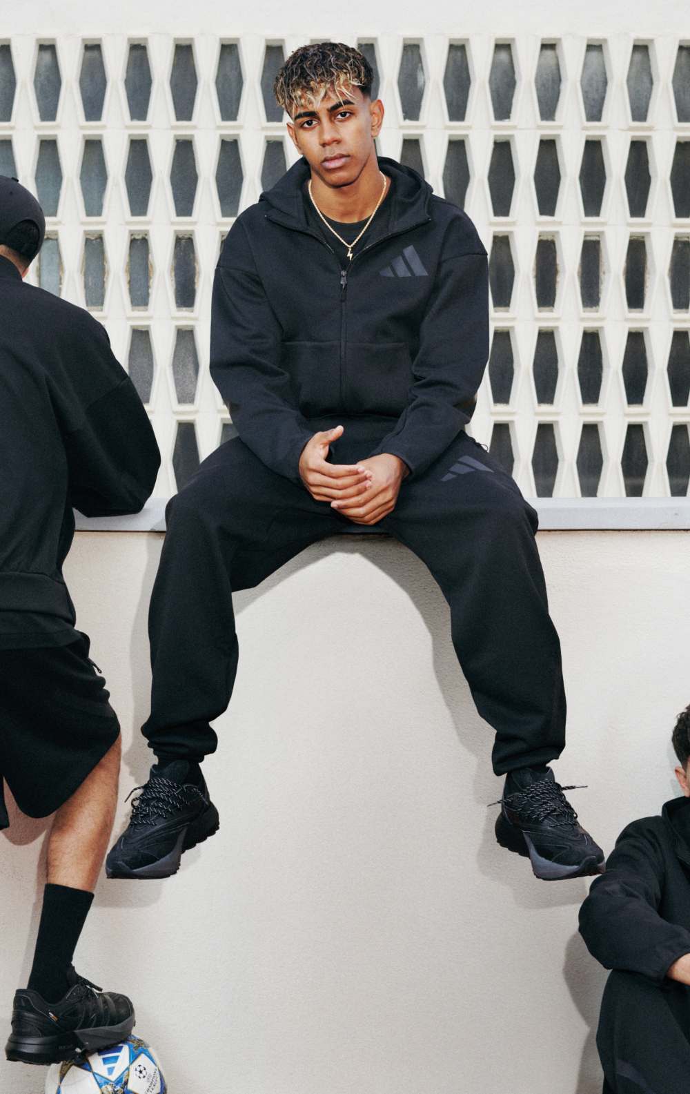 本次亞馬爾以兩套造型詮釋新世代運動員的休閒態度:紫色套裝搭配 Z.N.E. 短褲,三層 PRIMEKNIT 棉質面料結合經典連帽設計與加高領口,提升穿著時的包覆性與安全感。內層疊搭黑色Z.N.E.圓領上衣,營造出活力與輕鬆自信兼具的氛圍;黑色套裝中則選配Z.N.E.運動束口長褲,黑色膠印設計低調點綴其中。兩套造型不僅凸顯亞馬爾的個人風格,更延續他與隊友的默契與凝聚力。