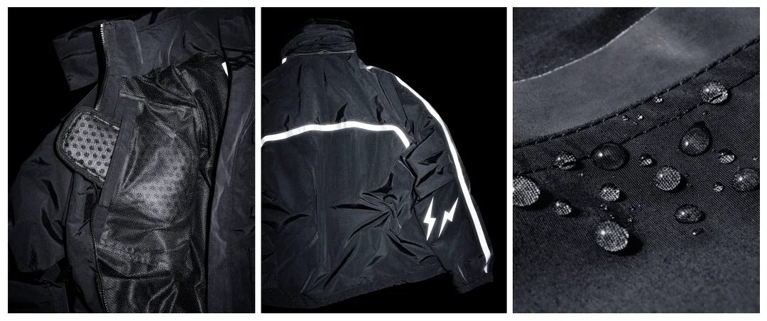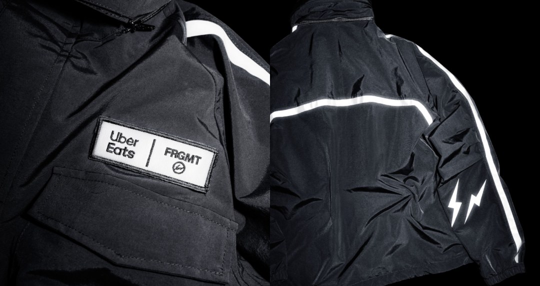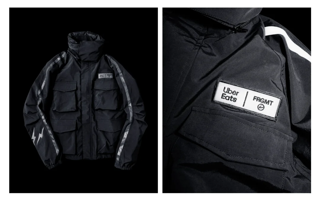 這項企劃源自 Uber Eats Japan 提出的「透過潮流時尚提升外送安全意識」理念,在 fragment 主理人藤原浩親自操刀下,右邊袖口印有代表性的閃電反光圖案,左胸則配置 Uber Eats 與 fragment 雙品牌 Logo,再融合 KOMINE 的可拆式胸部安全護具以及防潑水材質,完成了這件日常也能時髦著用的外送夥伴專屬外套。