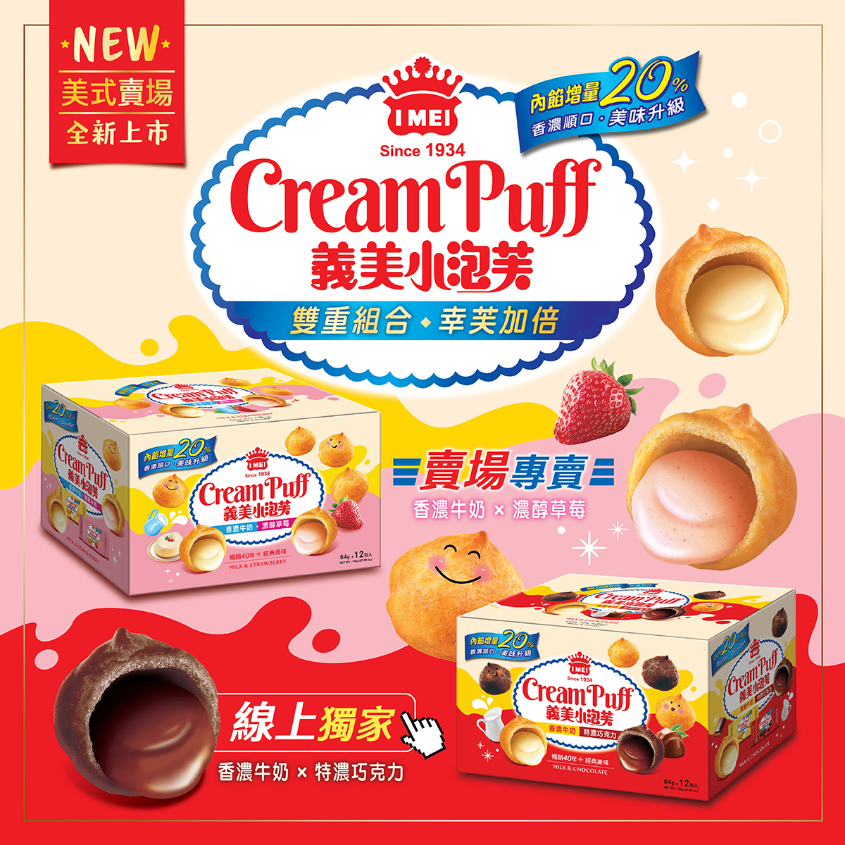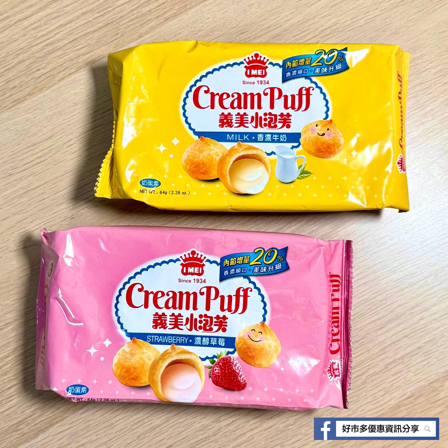 其實義美小泡芙除了經典的牛奶、巧克力、草莓外,你還能在義美門市以及各大通路找到檸檬、厚奶茶、黑可可、布丁、香焙咖啡等不同的限定口味,另外美式賣場 Costco 好市多販售的還是內餡增量20%的「升級版」。