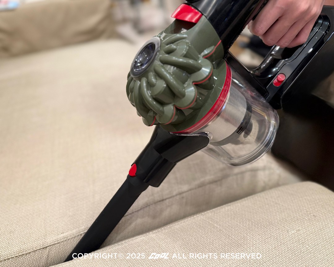Dyson V8 Cyclone 搭載升級版七芯鋰離子電池,續航力比前代 Dyson V8 提升 50%,最長可達 60 分鐘。可拆式電池設計讓使用者可隨時更換備用電池,打掃不中斷。在使用上我覺得唯一美中不足的是,電量僅能透過燈號判讀,對於習慣直接查看剩餘百分比的我來說稍嫌不夠直覺。