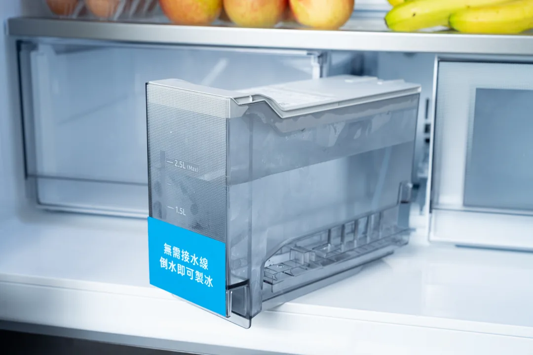 內建自動製冰機,不需水線安裝,只需將過濾或煮沸的水注入水箱。圖片來源:台灣三星