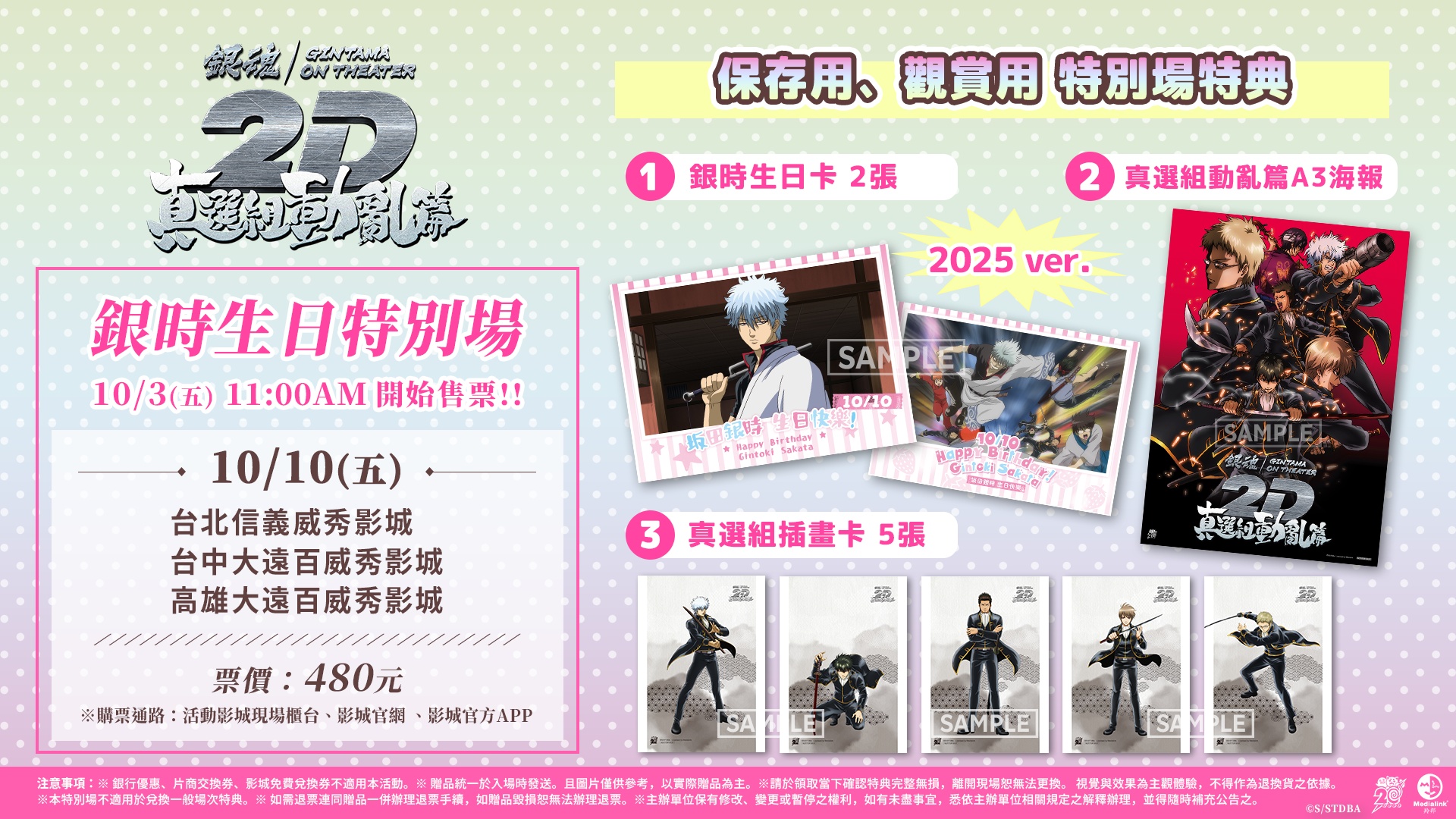 10 月 10 日的「銀時生日特別場」將於 台北信義威秀影城、台中大遠百威秀影城、高雄大遠百威秀影城 同步舉行,並於 10 月 3 日上午 11:00 正式開賣。觀眾凡購票即可獲得精美特典: