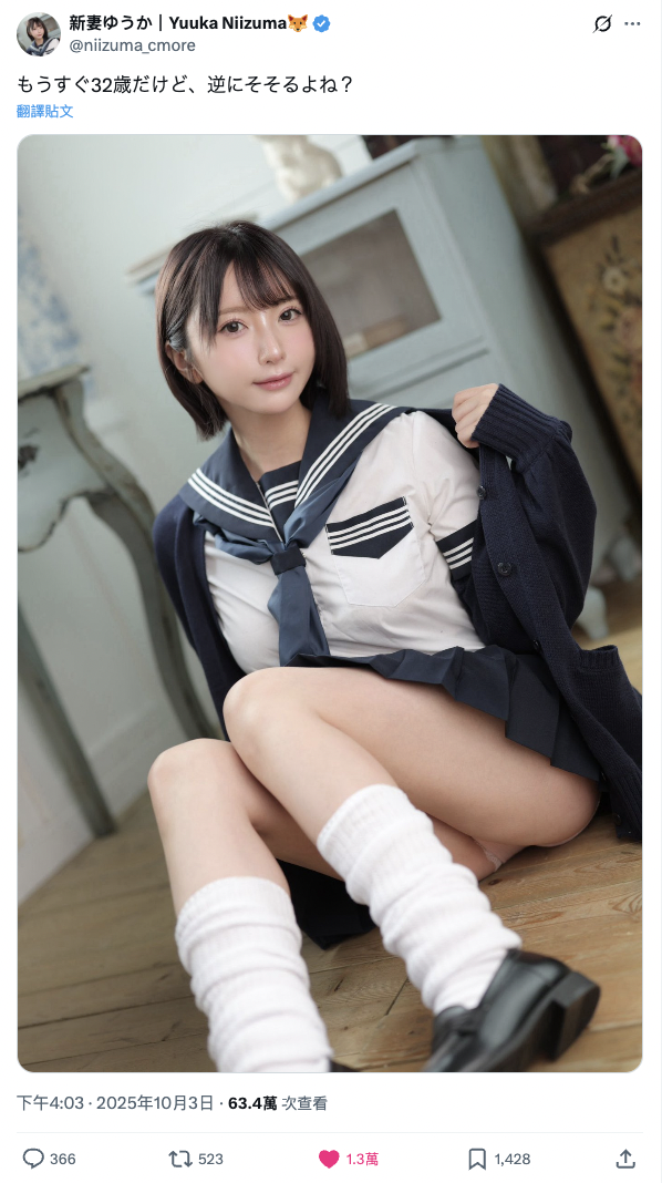 ▲ 即將迎來個人 32 歲時刻的「新妻ゆうか」,鑒於之前 po 出制服穿搭的緣由,便讓粉絲們寫下 “這容顏太逆天” 的留言。