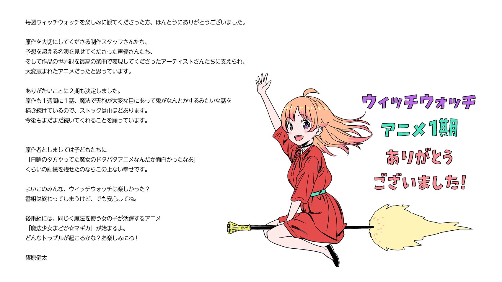 改編自篠原健太創作漫畫的動畫《WITCH WATCH 魔女守護者》第一季在經過半年終於在 10 月 5 日正式播映完畢,作品因其搞笑無厘頭又奇幻的劇情深受許多觀眾喜愛。而官方也馬上在最後一集播畢後確認了第二季製作的消息。