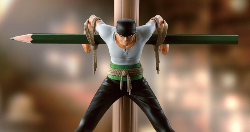 BANPRESTO 這次的設計靈感,源自於《航海王 ONE PIECE》羅羅亞索隆在海軍基地謝爾茲鎮被逮捕的經典劇情。可以看見它們還原了這位知名角色被五花大綁的霸氣神情之外,其黑色頭巾、服裝造型也被重新演繹。而讓人感到十分具有創意的是,粉絲們只要把筆從中間的繩索穿過,便能變成相當吸睛的筆架,相當具有收藏價值。