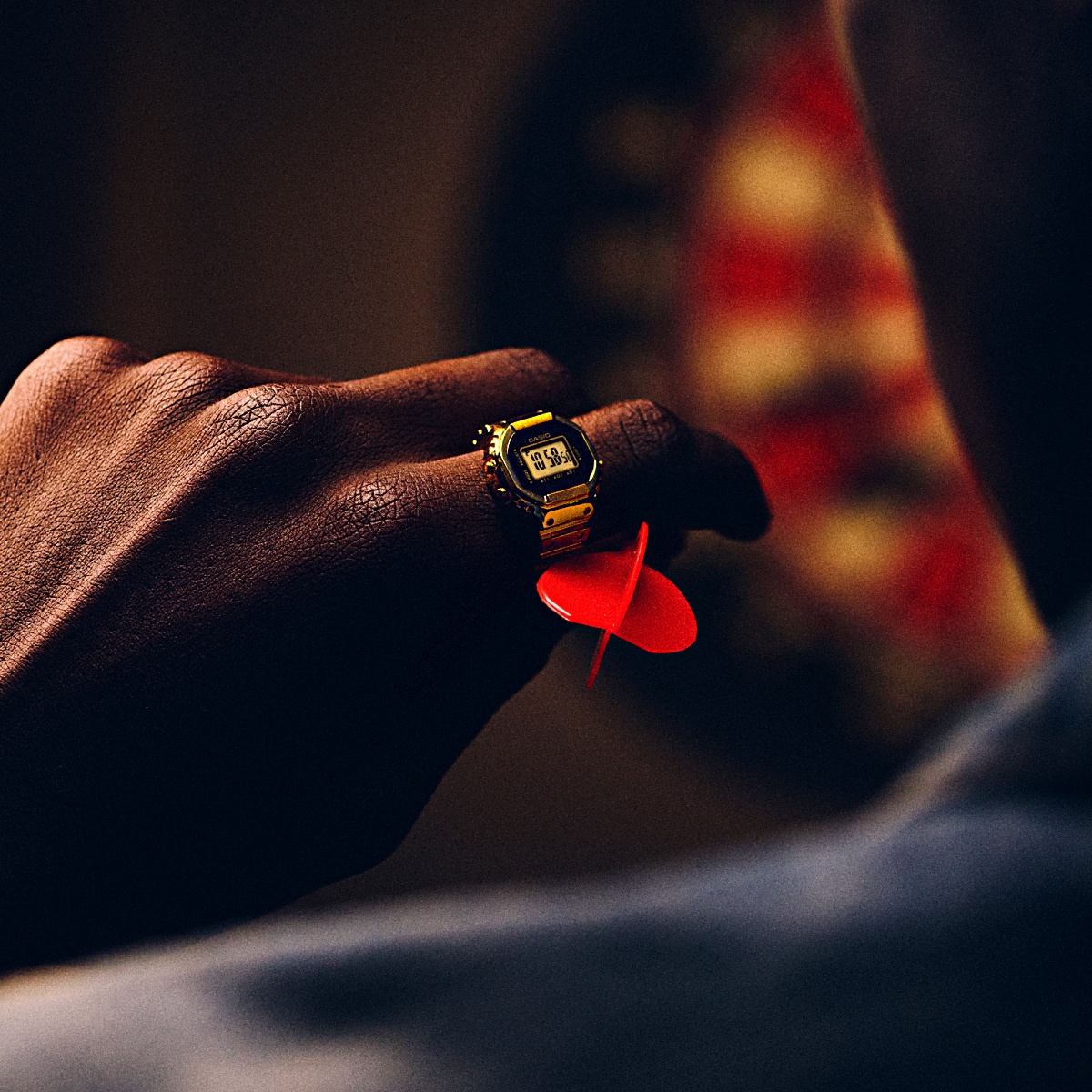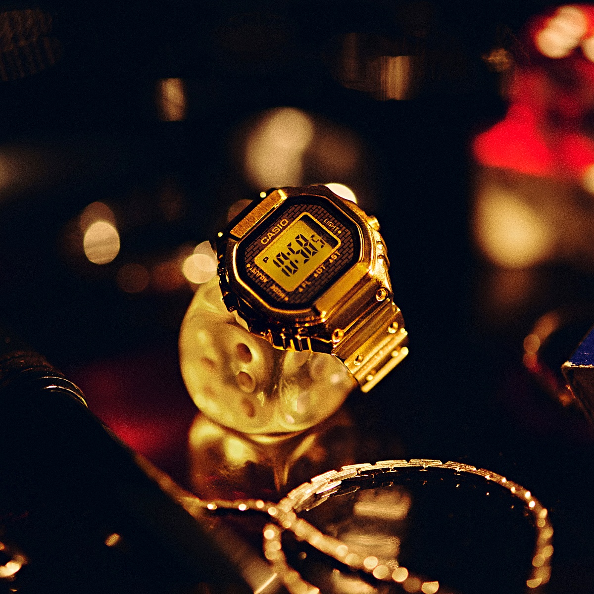 為實現戒指化設計,CRW-001G-9 採用優化的高密度安裝技術與微型電池,將標準手錶結構縮小近 10 倍,打造可配戴於指間的三按鈕數位錶。其錶殼、錶背與錶圈均以 金屬射出成型(MIM)技術 一體成型,完整保留 CASIO 經典外觀語彙,連錶帶凹凸細節亦被精密還原。表面經 金色 IP 電鍍處理,賦予金屬細緻光澤與層次感,展現出兼具時尚與收藏價值的迷人質感。