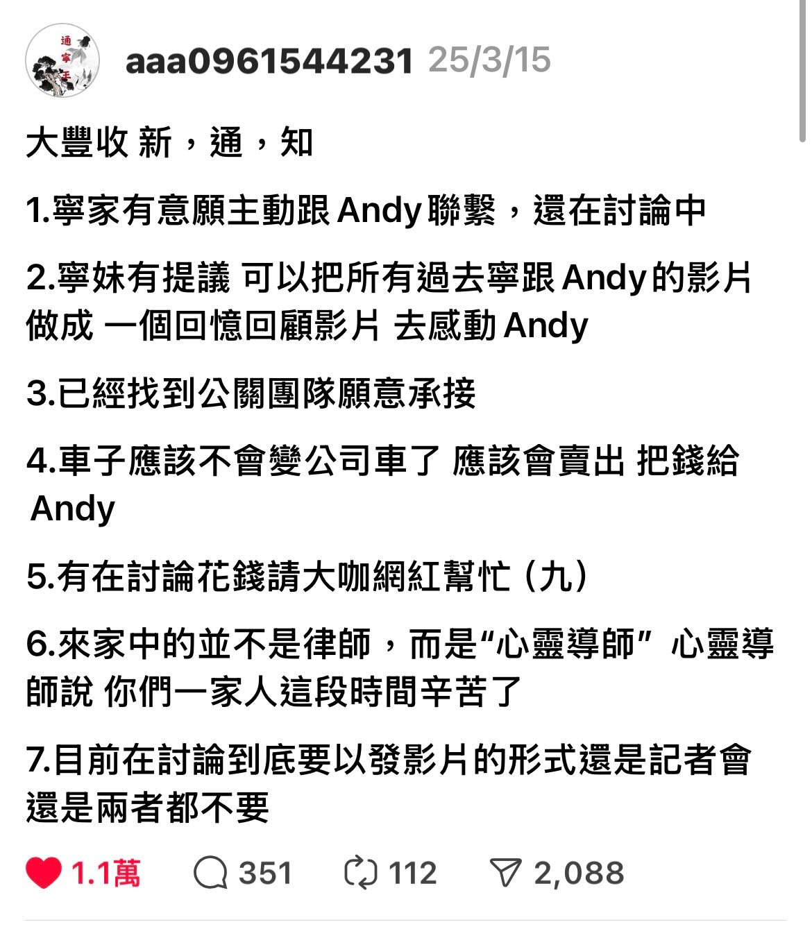 曾與家寧組成網紅團體眾量級的 Andy 老師日前大動作發布新影片,表示張家人要他人財兩失。在影片中控訴張家人透過群組和網軍攻擊他,還疑似企圖引誘他犯罪,消息一出引發網友熱議。令人驚訝的是,有網友發現,今年三月,號稱「通寧王」的Threads 網友早就曾預測這場事件的多點細節。