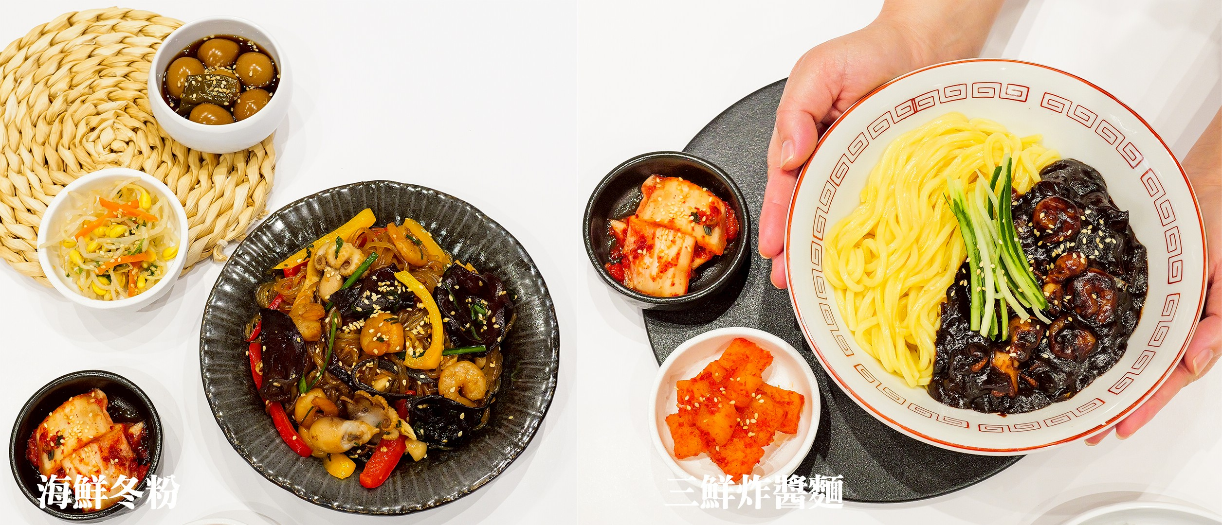 • 三鮮炸醬麵:Q 彈麵條搭配濃厚炸醬,結合蝦仁、花枝、貝類等食材,道地韓味一口滿足。