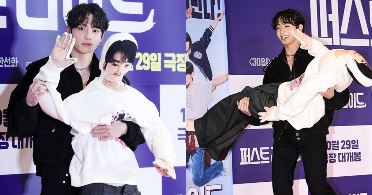 田柾國代替摯友車銀優在電影《放飛旅行團》VIP 首映會上走紅毯,他特地帶著「車銀優真人版抱枕」登場,柾國一手摟著車銀優真人版抱枕的腰,一手將抱枕擺出各種姿勢,還將抱枕對著粉絲們敬禮。最終柾國「公主抱車銀優」抱枕離場,可愛搞笑又誠意十足地表現,逗樂現場觀眾。