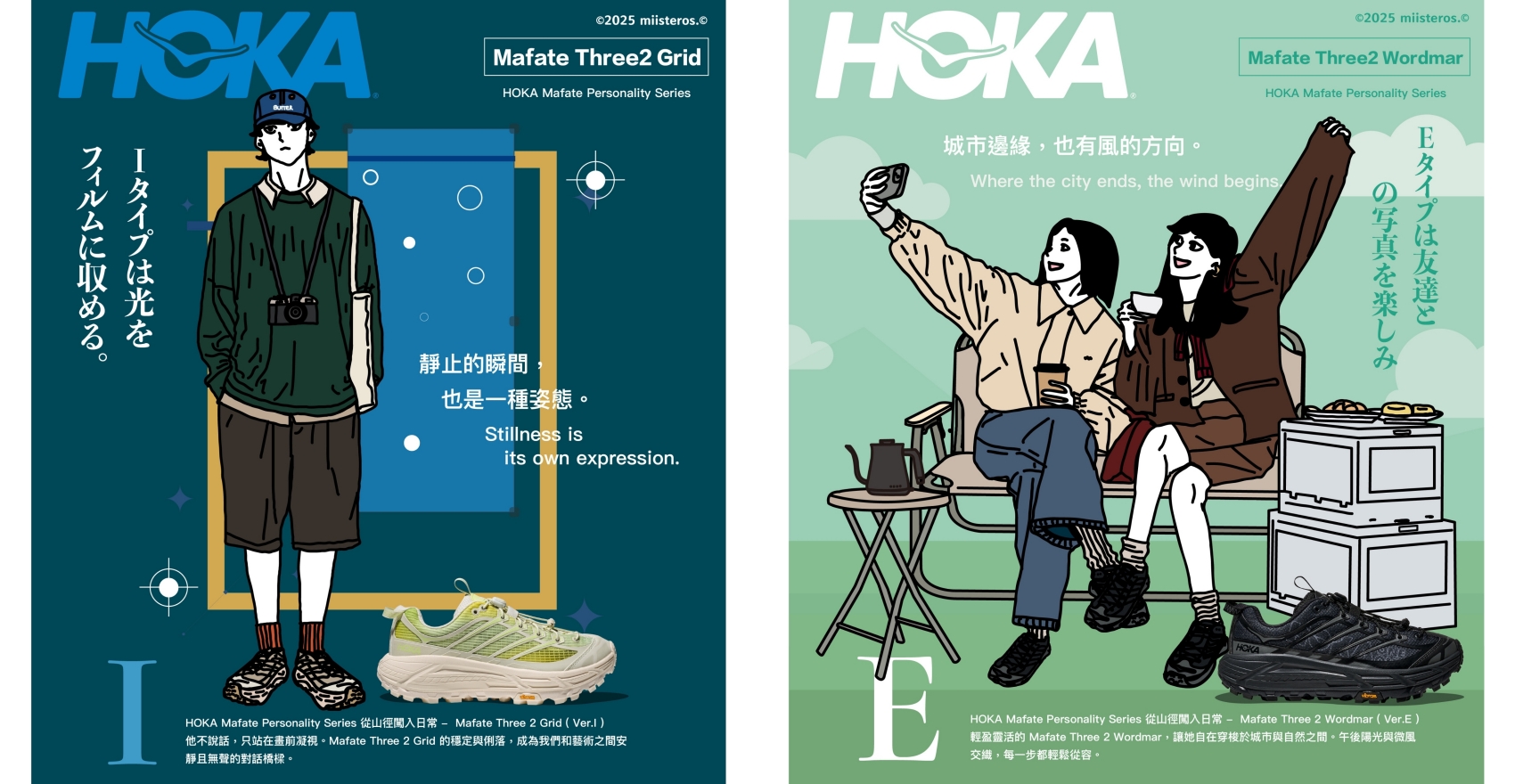 為了更具象化這份理念,HOKA 特別邀請具現化系的知名插畫家 miisteros.© 米斯特,以 MBTI 的人格視角,詮釋「HOKA Mafate 系列 × MBTI」的雙重風格型態,除了登上伸展台,也能走入你的日常!無論你是熱愛聚光燈、永遠在行動的 E 人,還是喜歡沈浸自我世界、細細觀察的 I 人,HOKA Mafate 系列都能輕鬆融入你的穿搭風格中,讓每一步都走得自信、自在,隨時拿出最好的自己!