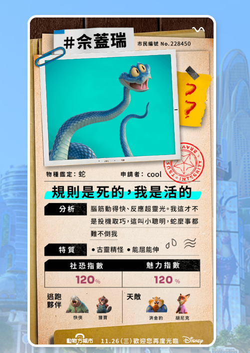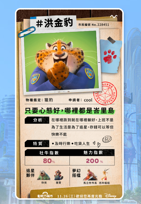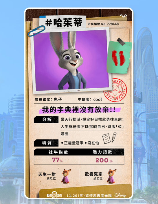 回答完以上9條問題後,就可以等待結果出爐啦!還可以看看自己的各項指數。全網已經開始在社群平台分享自己的測驗結果,掀起一波「你是哪種城市動物?」的互動熱潮。這不只是電影預熱,也讓粉絲能提前以趣味方式融入《動物方城市2》的世界。快約朋友一起來玩,看看你在這座城市裡到底是兔子、狐狸,還是神秘的蛇吧!